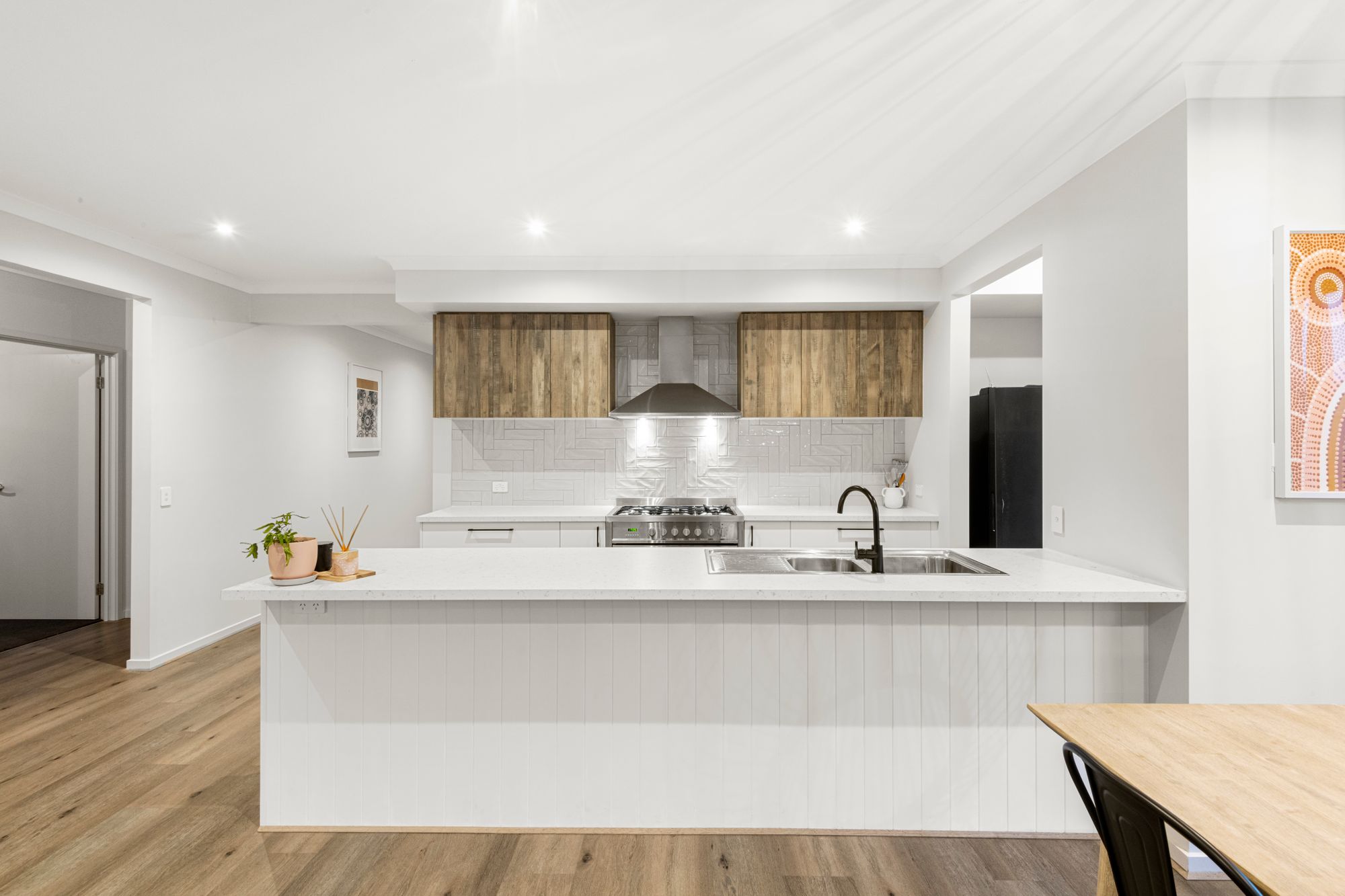 Kitchen: 20mm stone bench with breakfast overhang, panelling, timber laminate flooring, stunning feature tile splashback, 900mm gas cook top and oven, overhead cabinetry, storage, down lights, large walk in pantry with shelving, dishwasher, double sink, black tapware and fittings.