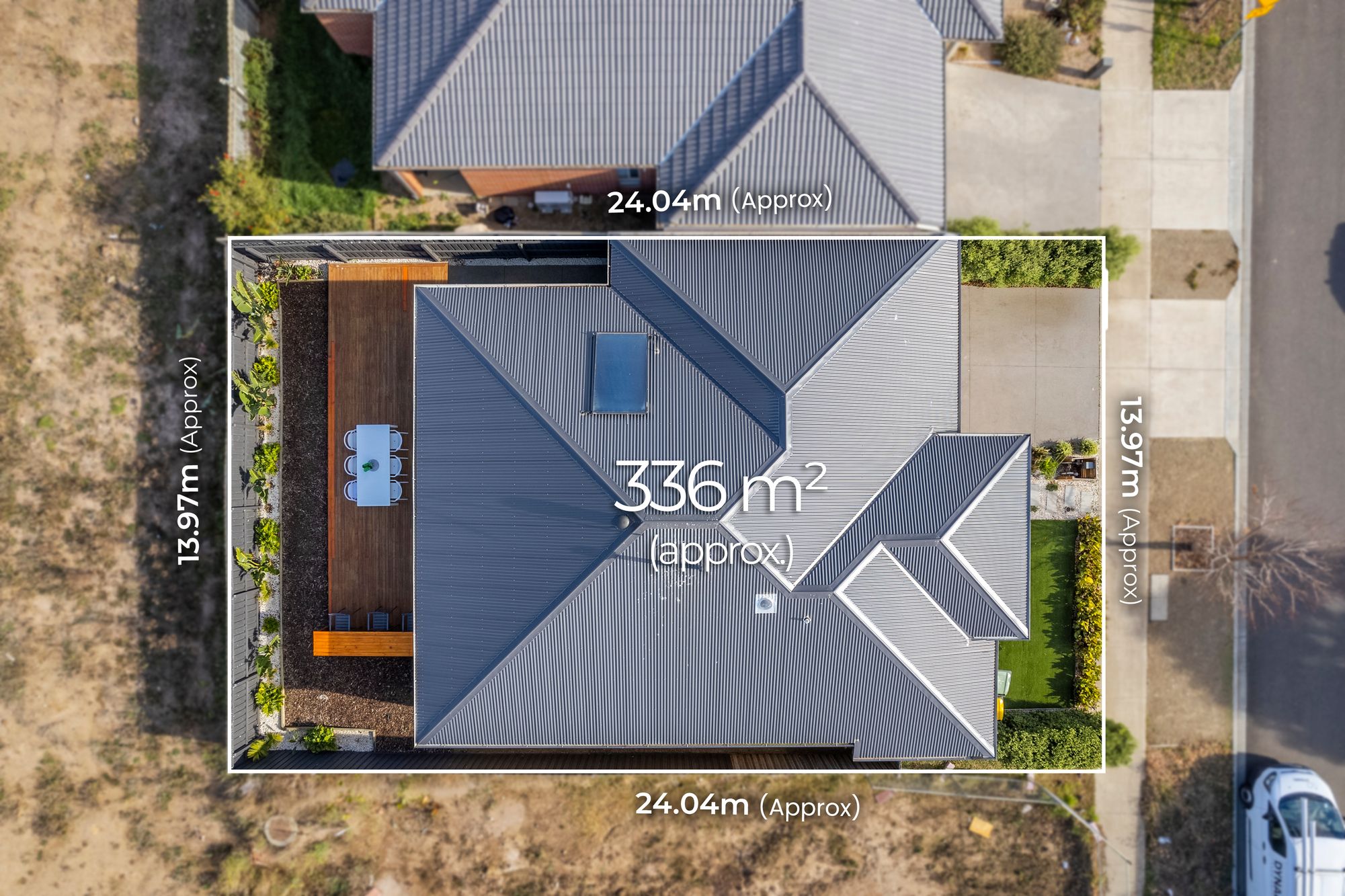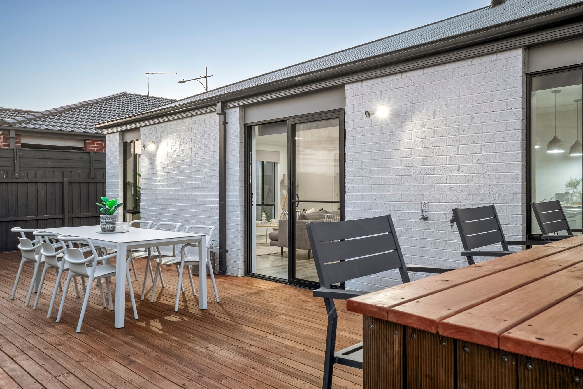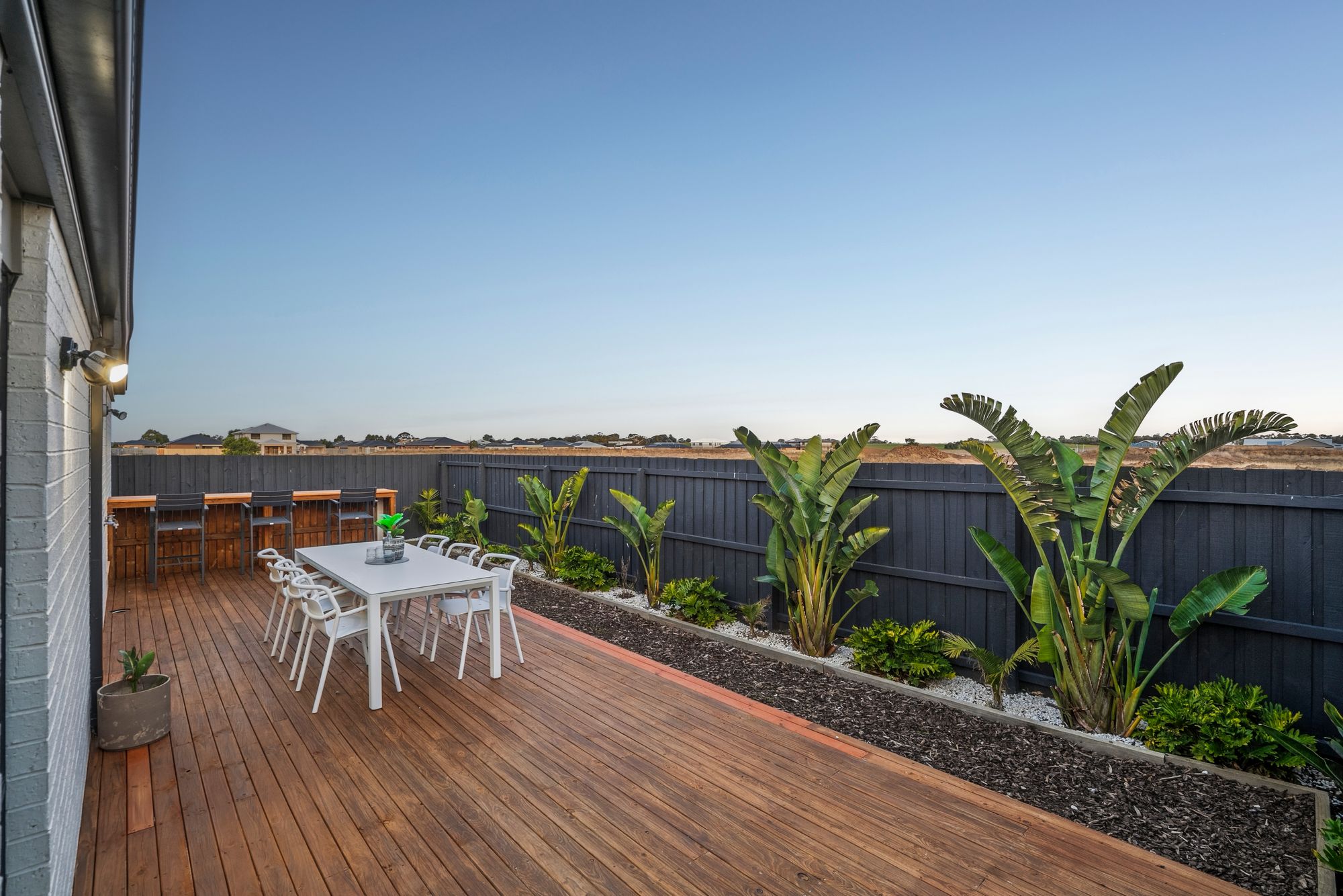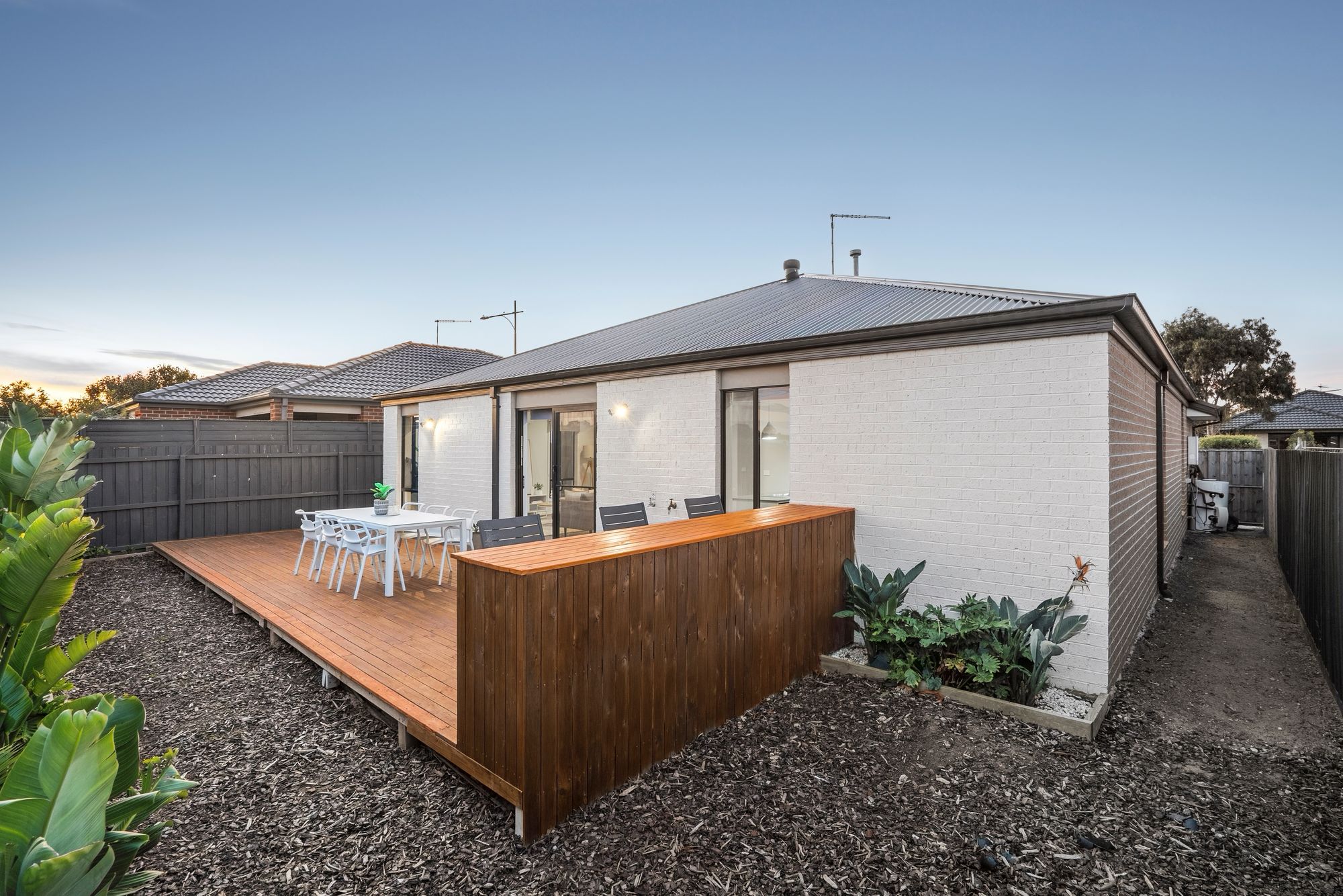 Outside: Large decked entertaining area, low maintenance & private yard, grass, established garden beds, single side gate access