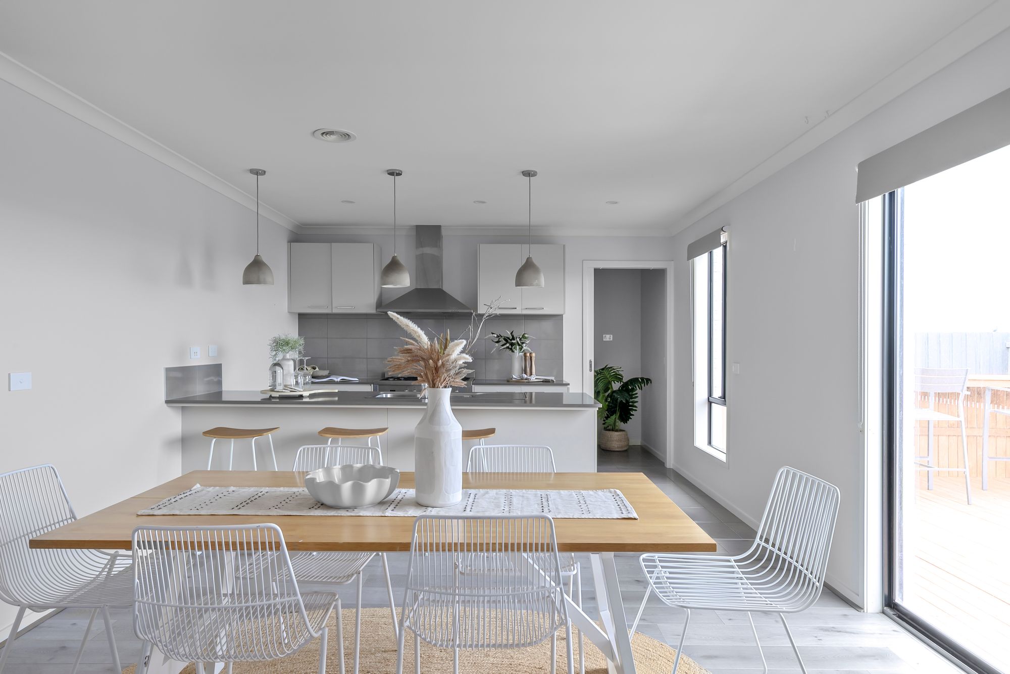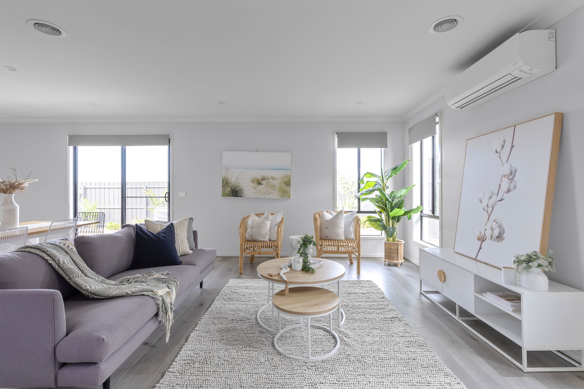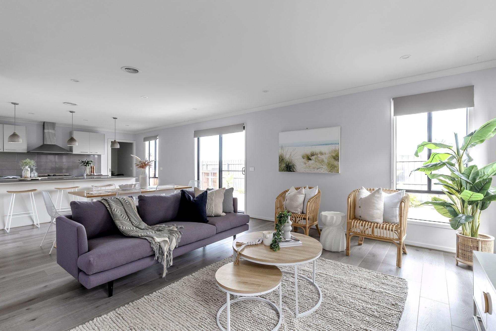 Living/dining: Open plan adjoining living/kitchen/dining, timber laminate flooring, roller blinds, ducted heating & split-system cooling, downlights, glass sliding doors to outdoor entertaining area