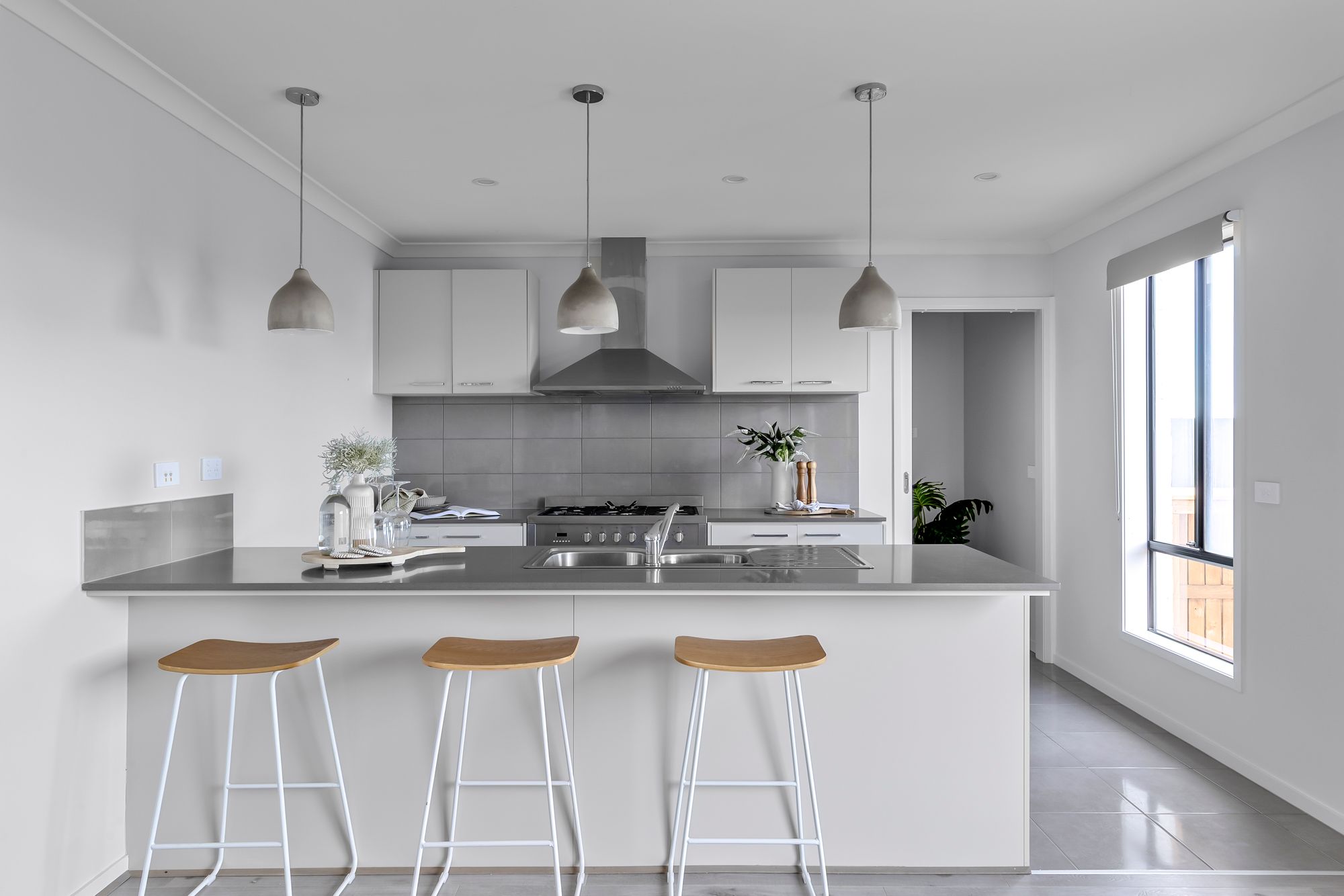 Kitchen: 20mm stone benchtops, island bench with breakfast bar overhang, 900mm gas cooktop/oven/rangehood, tile splash back, walk in pantry, chrome fittings, overhead cabinetry, down lights, pendant lights, floor tiles and timber laminate flooring, dishwasher, window allowing natural light with roller blind, microwave provision, walk-in pantry with generous storage and fridge cavity space