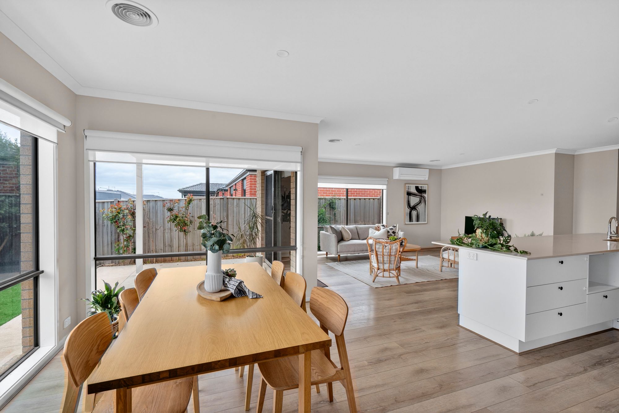 Open Plan Living/Dining: The expansive open-plan living and dining area is filled with natural light and features high ceilings, downlights, and wide windows with dual blinds. Sliding glass doors lead seamlessly to the rear yard, creating a bright and inviting space for entertaining or relaxing. Ducted heating and split-system cooling provide comfort throughout the seasons.
