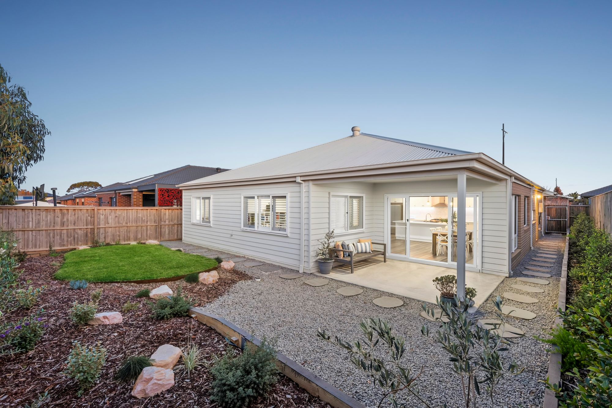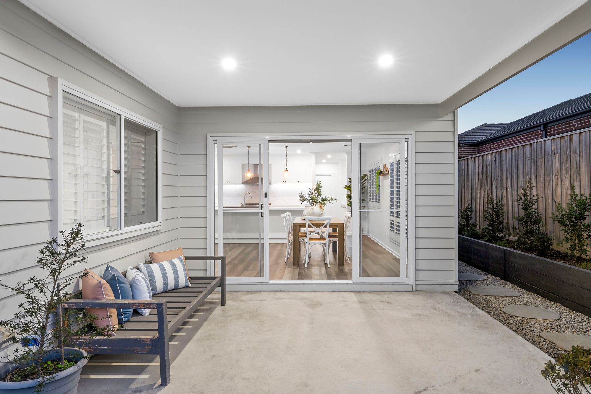Outdoor Entertaining: North-facing concreted alfresco, downlights, professionally landscaped gardens, grassed area, and single side gate access—perfect for year-round entertaining and outdoor living.