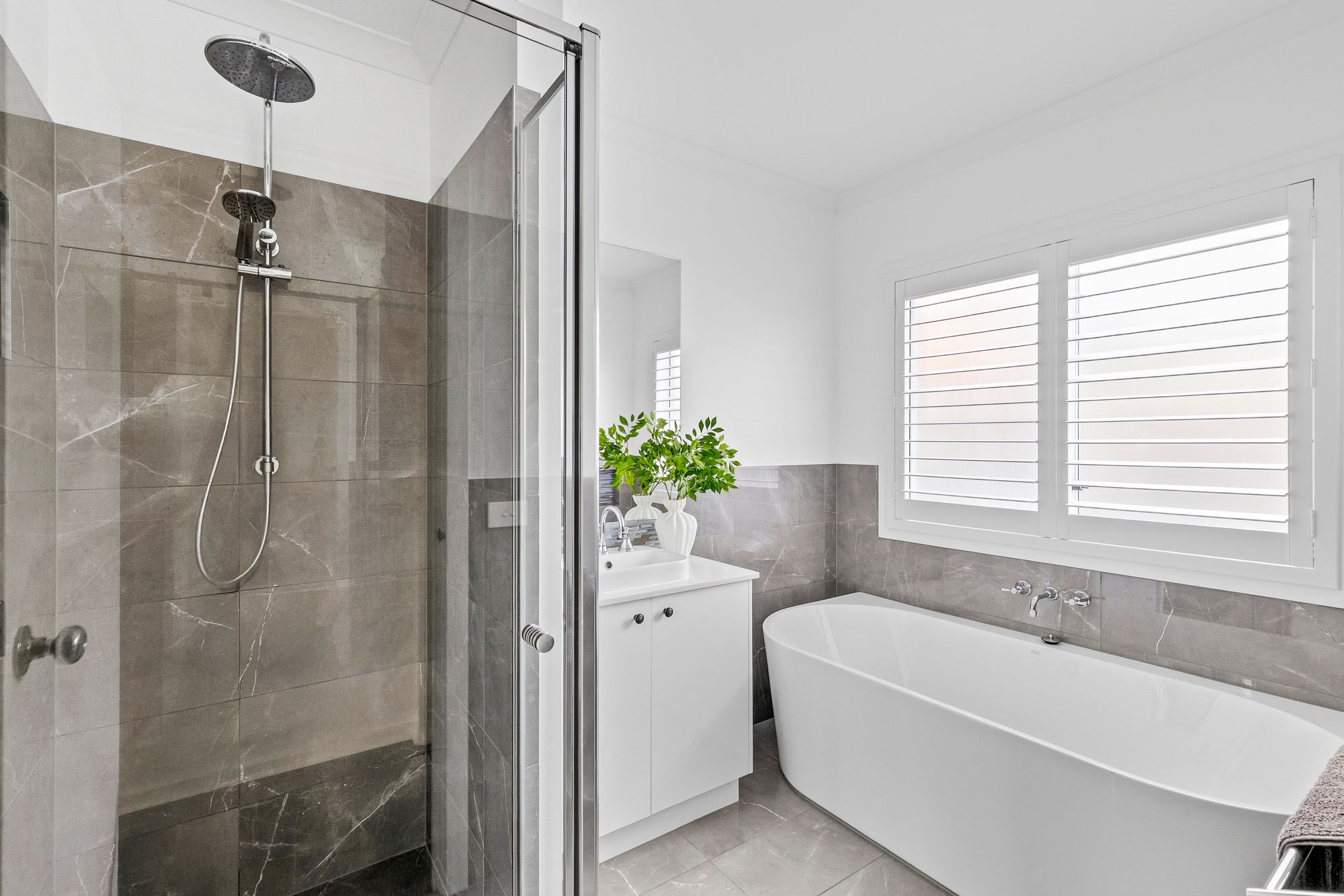 Main Bathroom: Organic white Caesar stone benchtop vanity with storage, fully tiled shower with niche, waterfall and handheld showerheads, upgraded bath with tiled niche, feature tiles, shutters, upgraded tapware, towel rack, and a separate toilet.