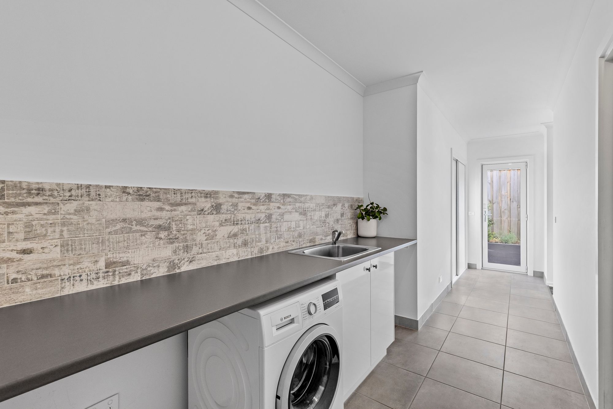 Laundry: Walk-through design with extended benchtop, trough, external access with an upgraded Aluminum glazed door, and seamless flow to butler’s pantry and kitchen. Includes walk-in linen closet and separate linen press.