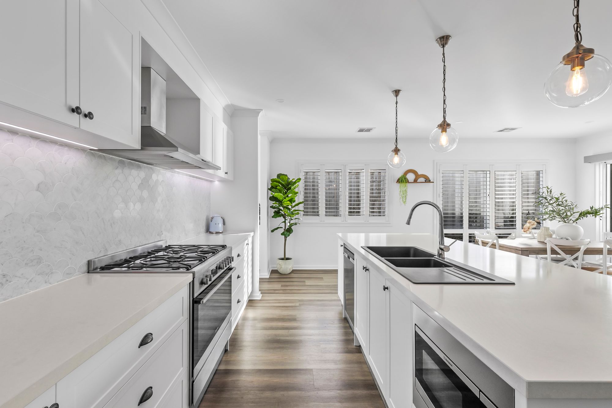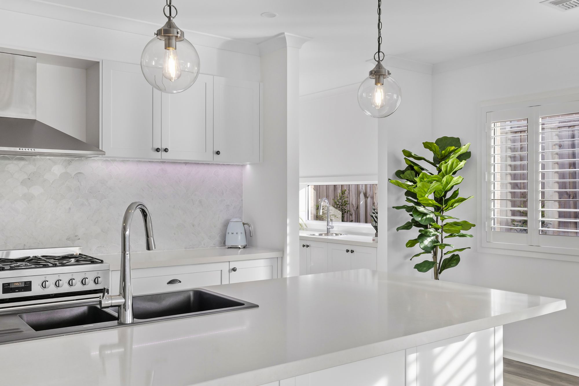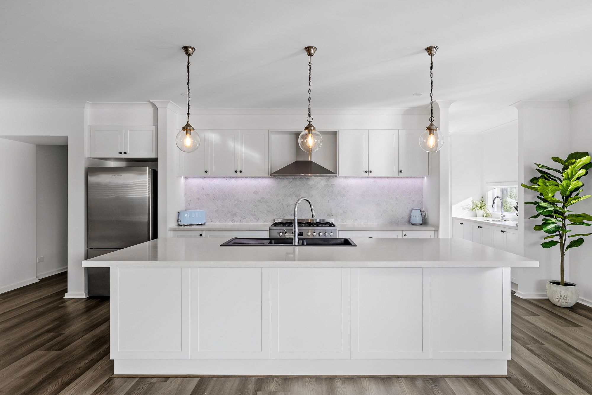 Kitchen: 40mm Organic white Caesar stone benchtops and island bench with breakfast bar overhang, Carrara Marble mosaic tile backsplash, upgraded tapware, feature pendant lighting, 900mm built-in appliances, upgraded shaker cabinetry with premium handles, range hood, under-mount sink, overhead cabinetry, fridge cavity, and feature strip lighting. Featuring a spacious butler’s pantry with upgraded sink and window splashback.