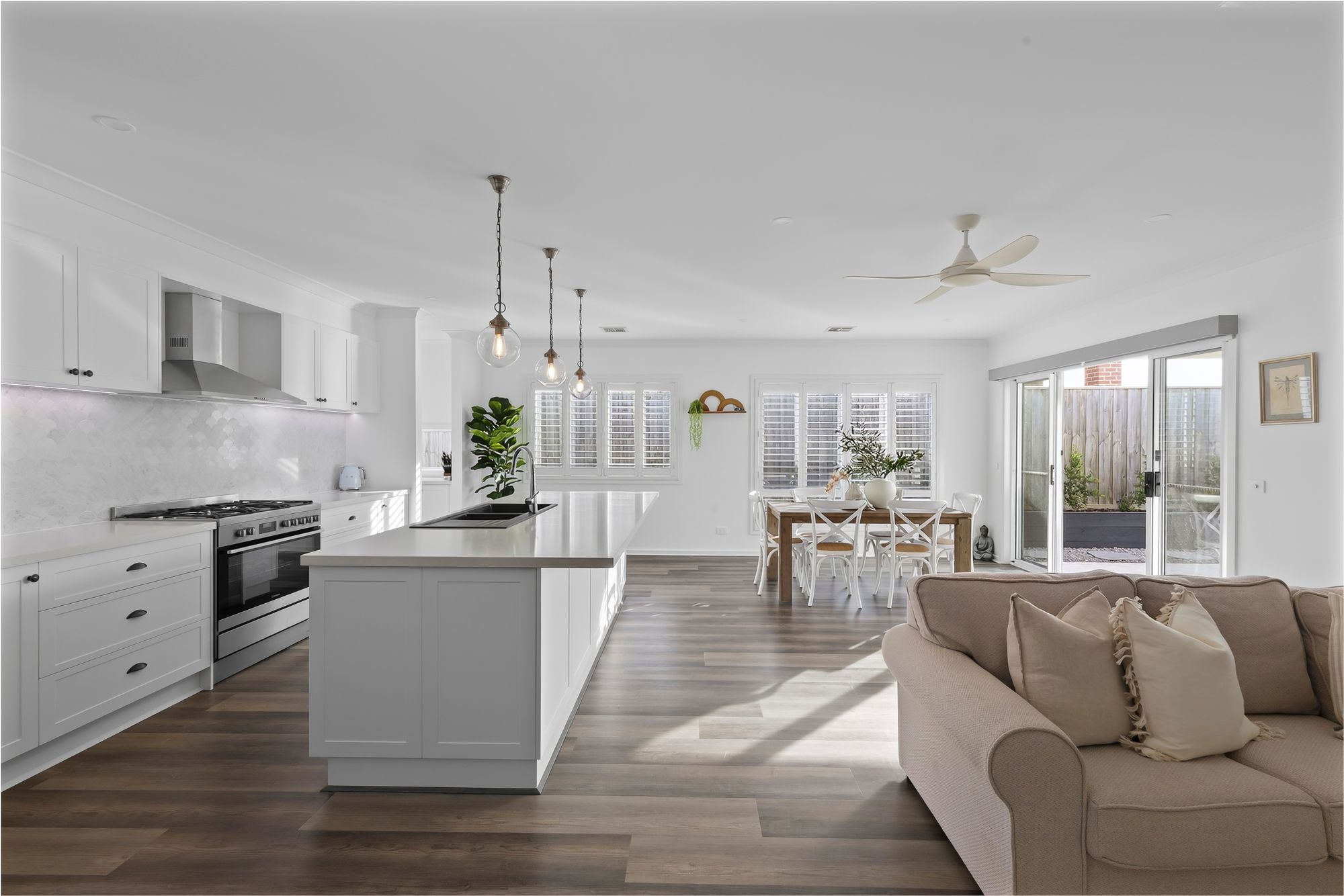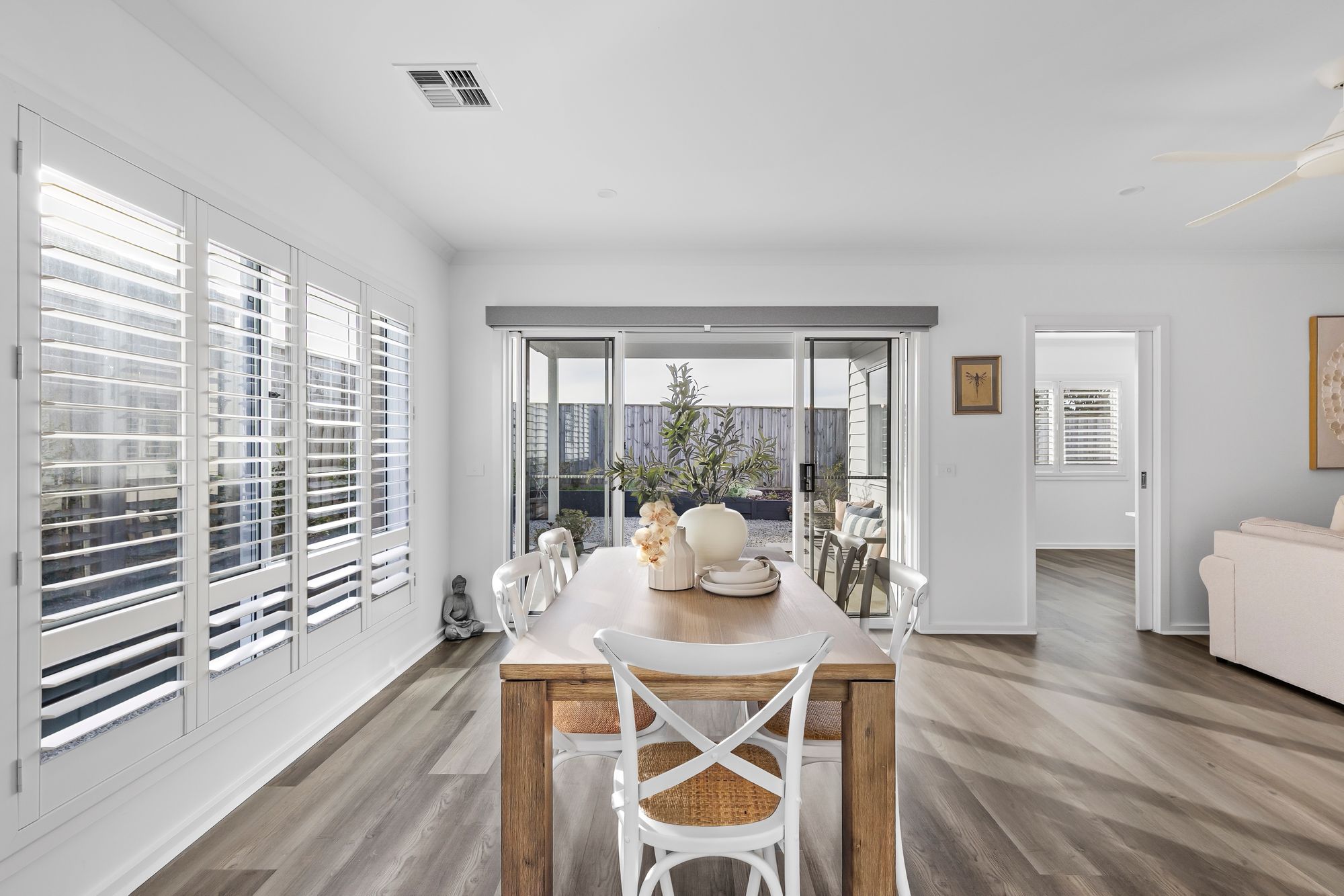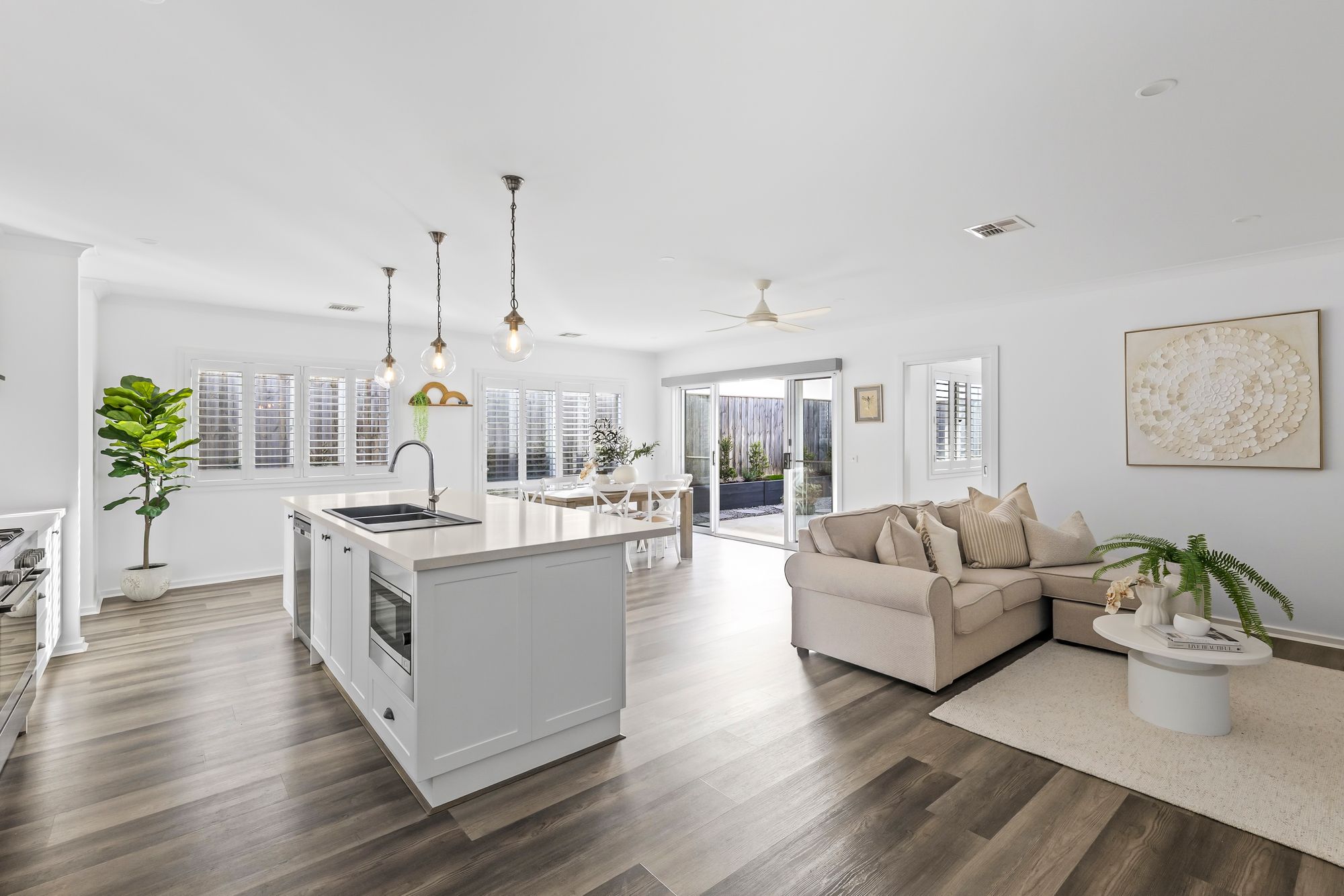 Living/Dining: Open-plan layout, feature windows with plantation shutters, high ceilings, and electric blinds on sliding doors opening to the alfresco area, hybrid flooring, refrigerated heating and cooling, TV points, downlights.