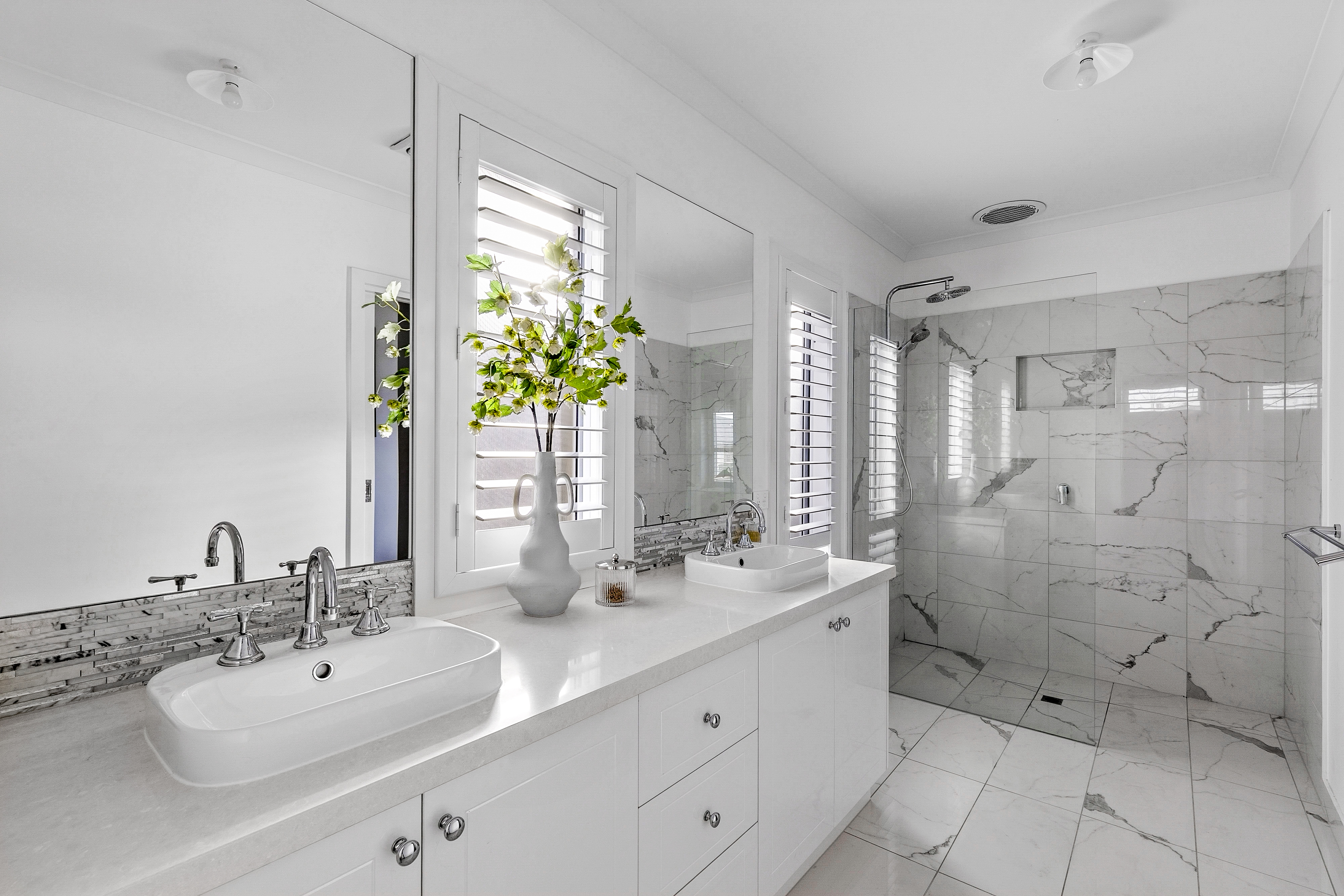 Ensuite: Fully tiled shower with rainfall and handheld showerheads, Organic white Caesar stone vanity with upgraded basins, shaker doors and tapware, feature windows, mirror, heat lights, shower niche, towel rack, and separate toilet.