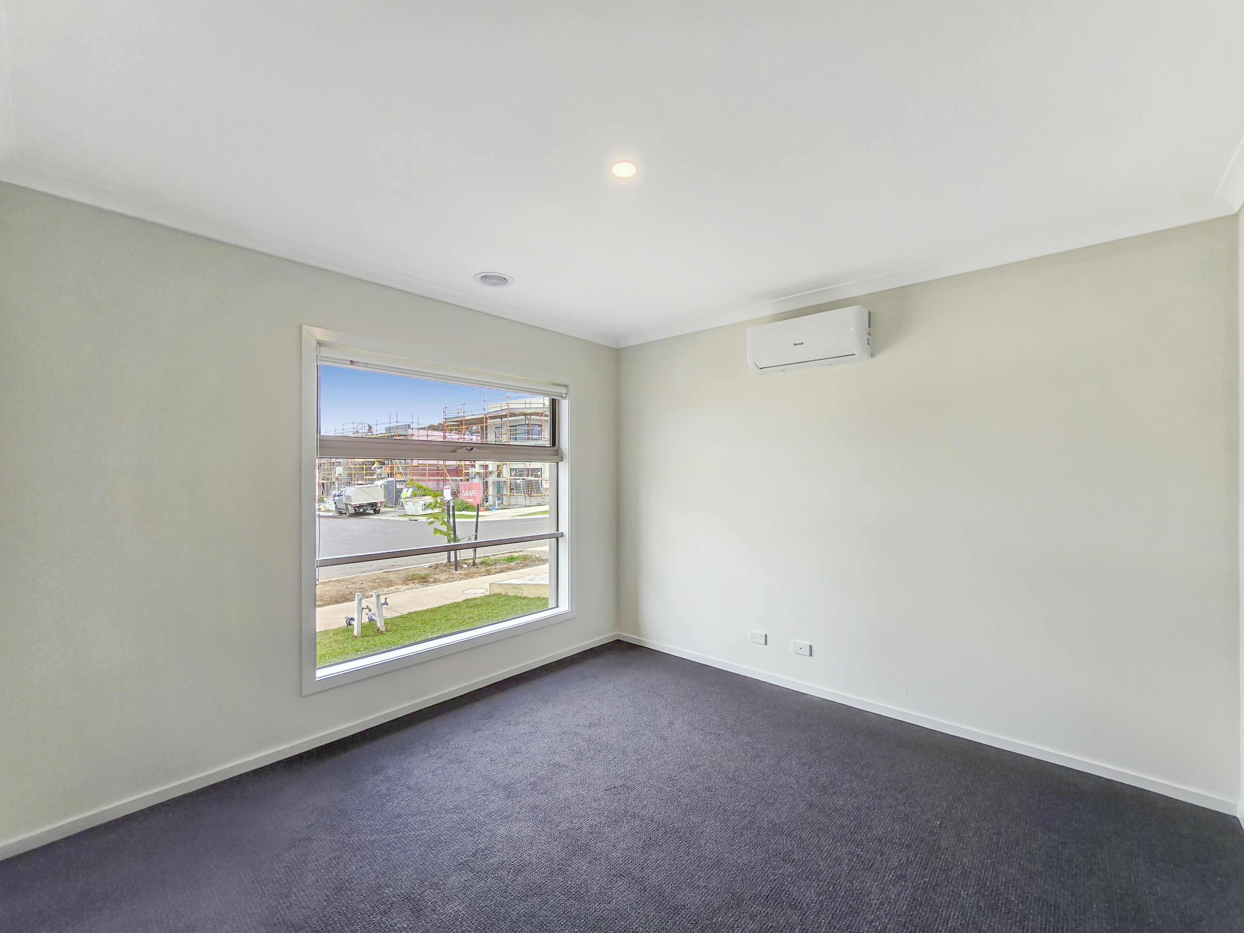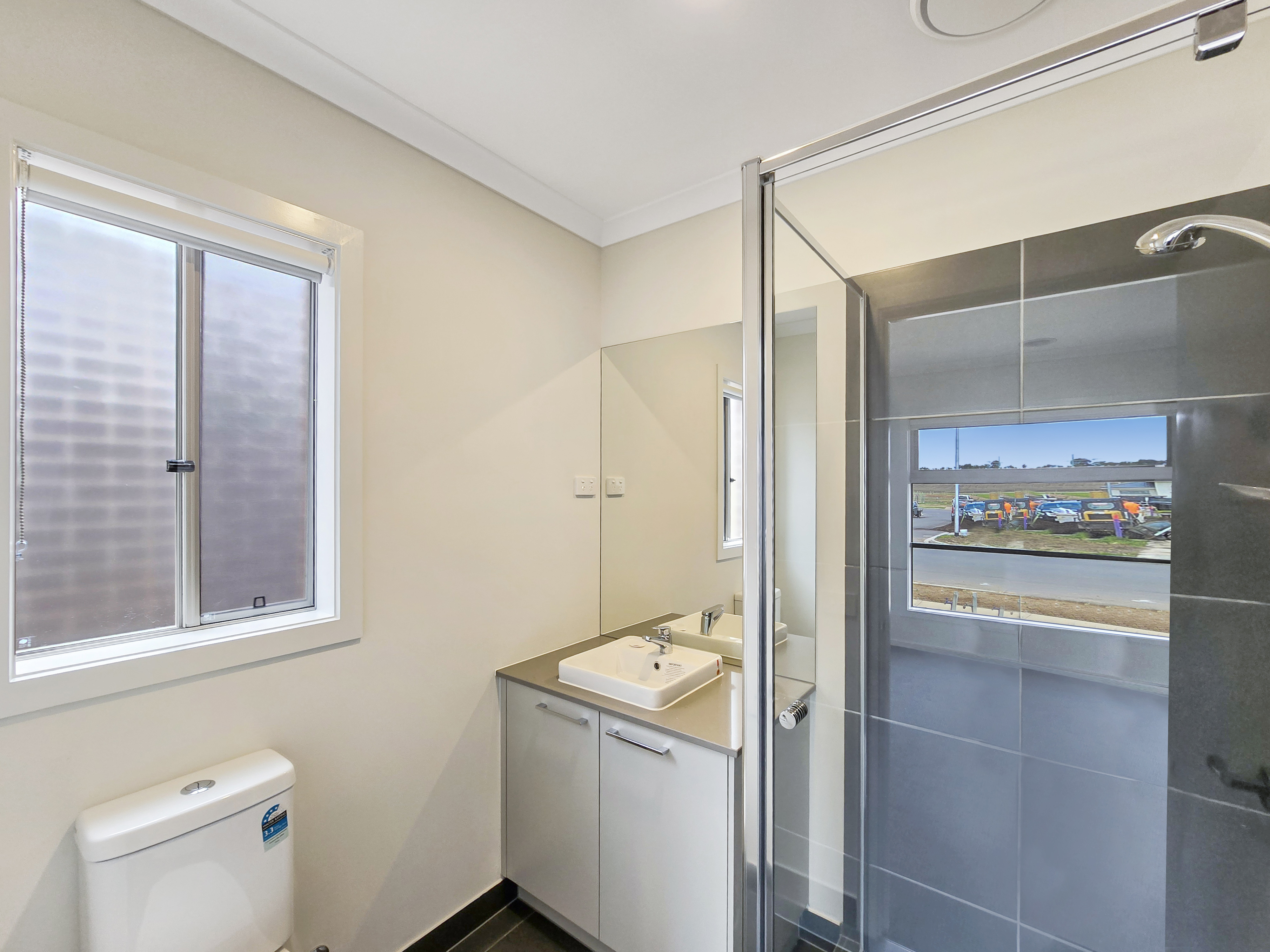Master suite: Situated at the front of the home, it showcases a spacious walk-in robe and ensuite. Accompanied by roller blinds, ducted heating, split system cooling and heating and carpet underfoot, creating a comfortable space year-round. The modern ensuite consists of a semi-frameless shower with a hand-held shower head, basin & stone benchtop vanity with a mirrored splashback, frosted window and toilet.