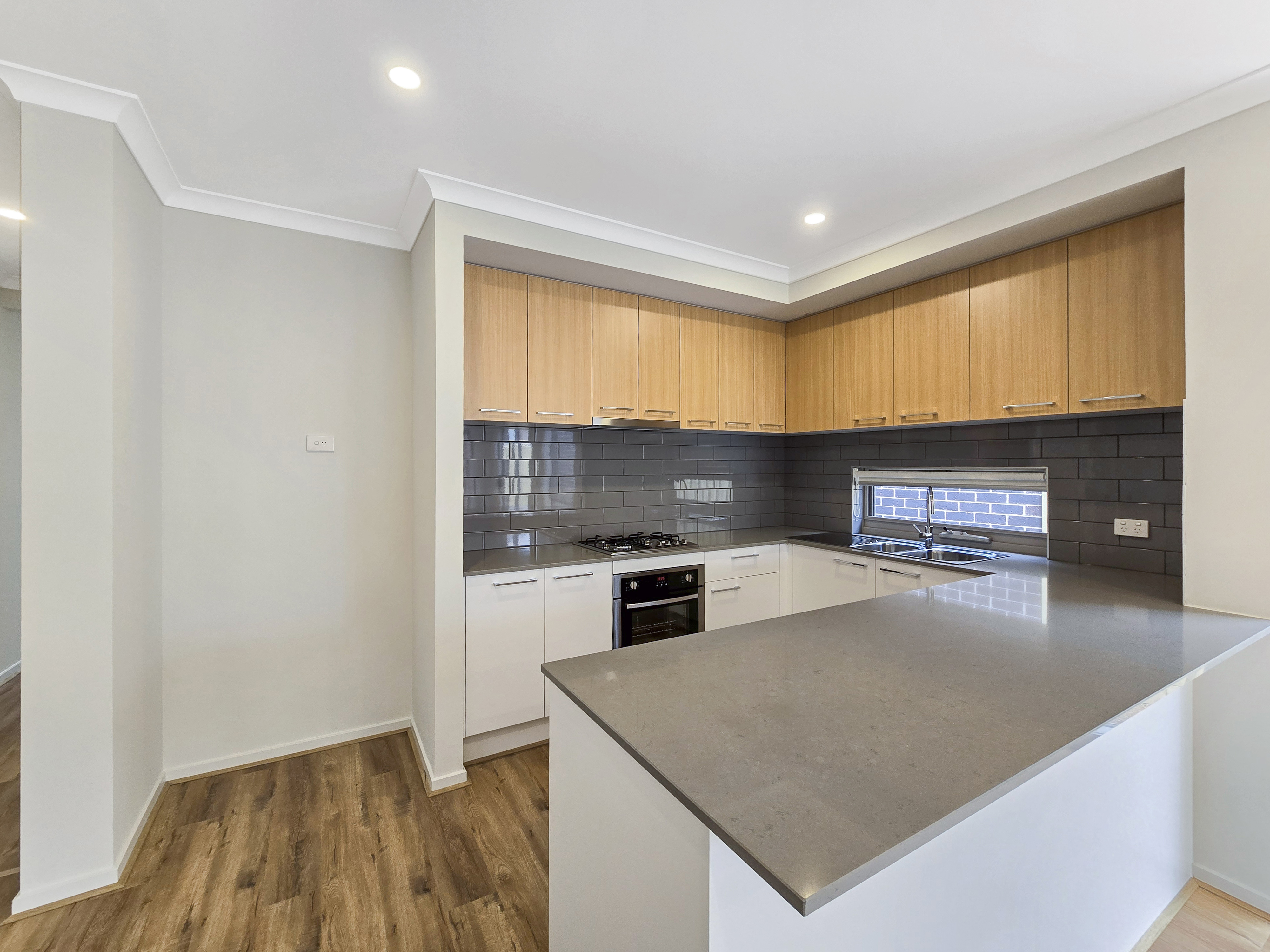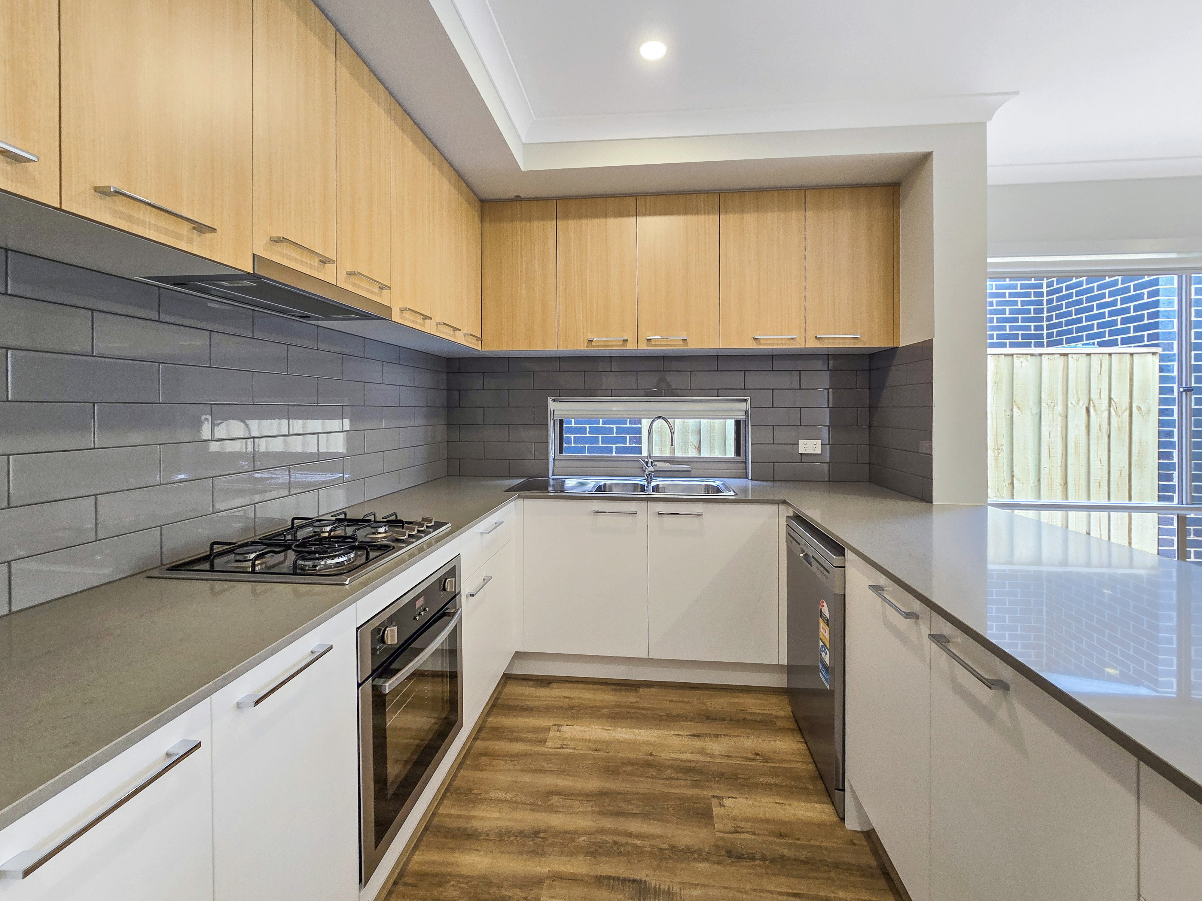 Kitchen: Benchtops with 20mm stone, breakfast bar overhang and stainless-steel double-basin sink, subway tile splashback & feature window splashback, downlights, coastal wood-look overhead storage, integrated 900mm oven, stovetop & rangehood, built in pantry