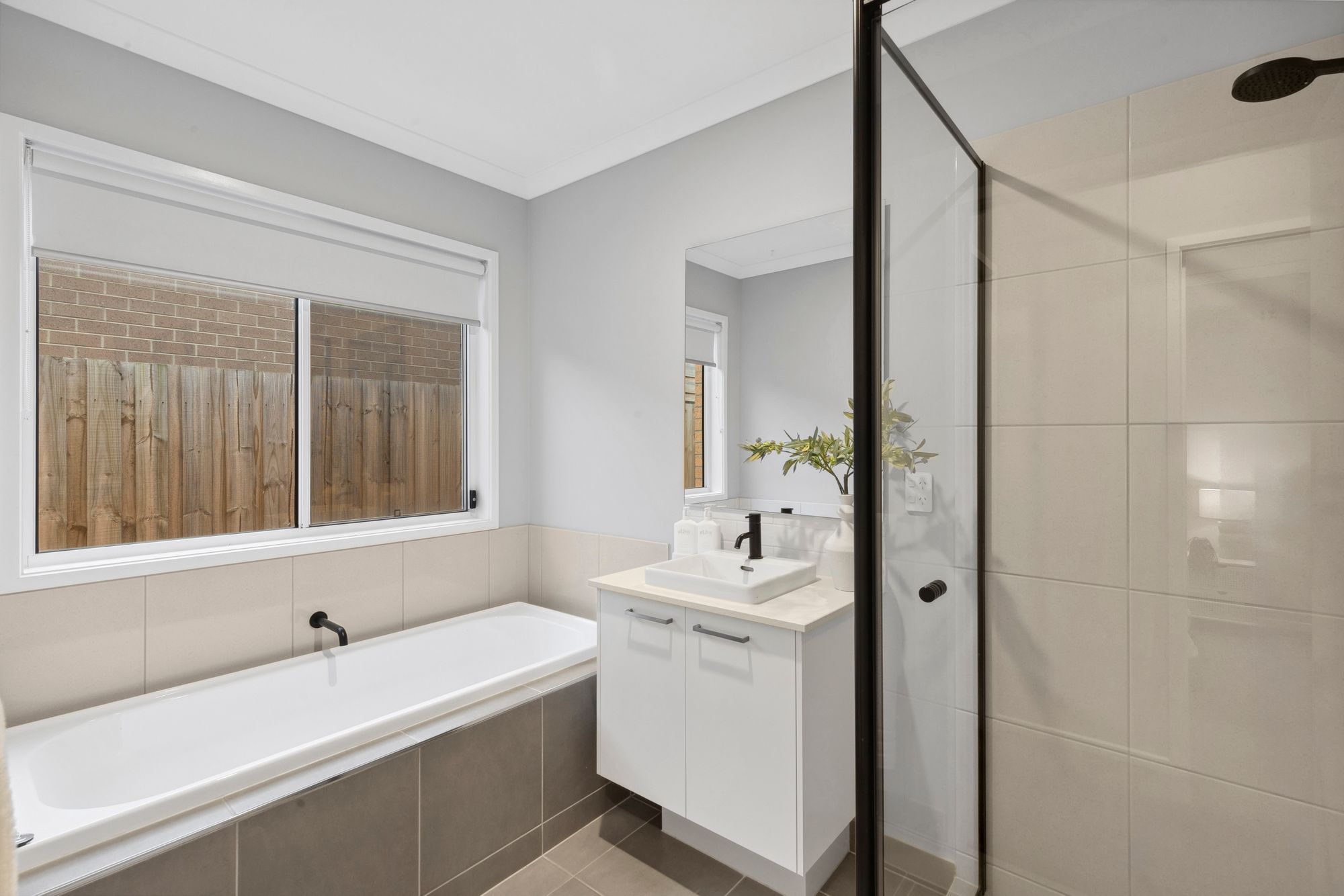 Main bathroom: 20mm stone vanity with ample storage, semi-frameless shower, black accents and tap ware, bath, window, roller blinds, tiles, seperate toilet.