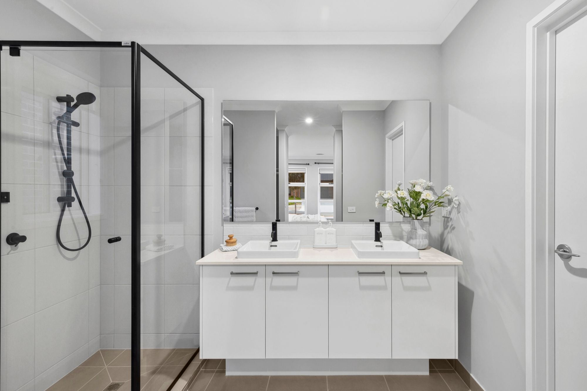 Ensuite: 20mm stone benchtop, Twin vanity with ample storage, semi-frameless shower with hand held shower head, feature tiles, black tap ware and accents, window, towel rack, seperate toilet, downlights.