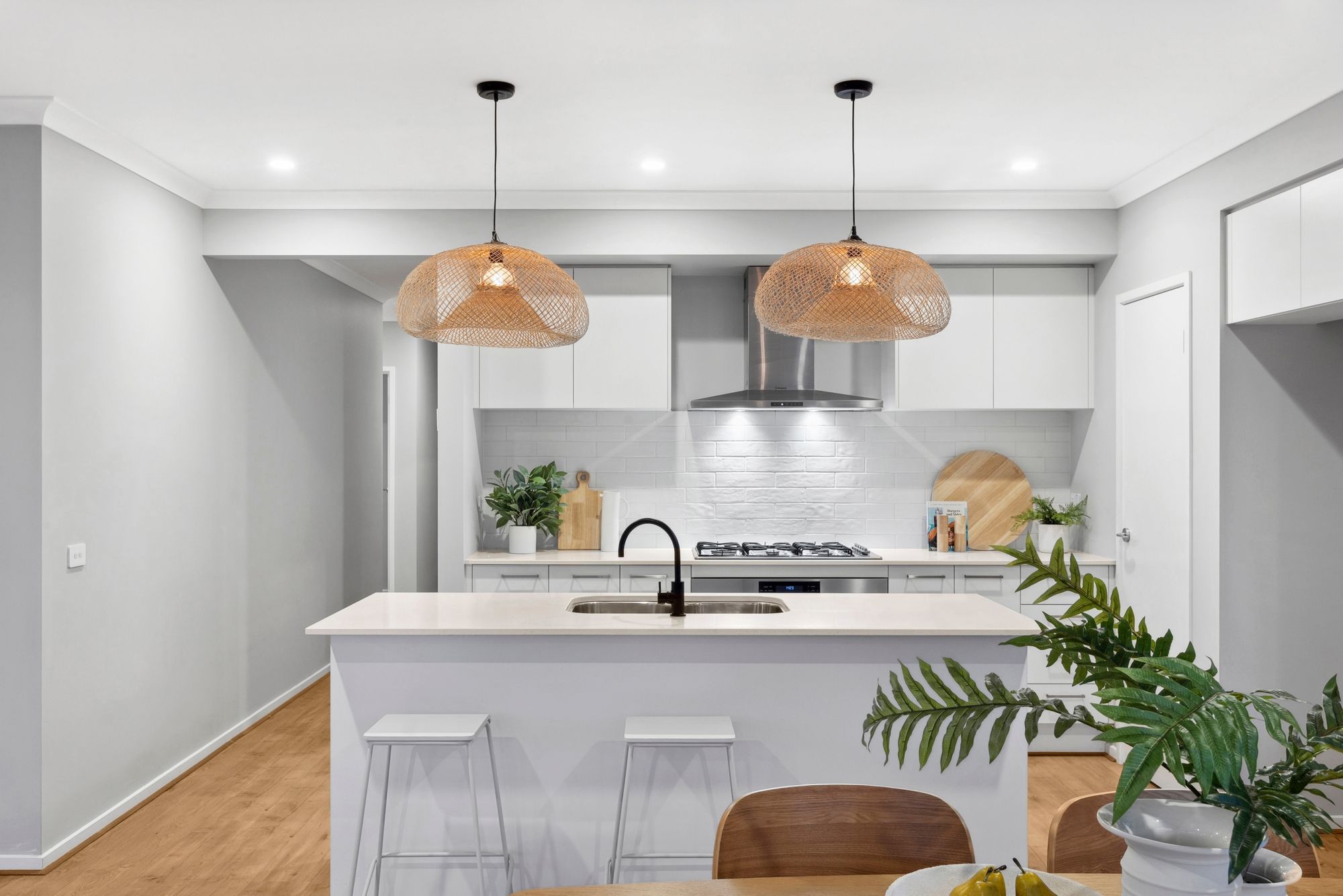 Kitchen: 20mm stone benchtop, breakfast bar overhang, feature tile splashback, pendant lighting, 900mmbuilt in Westinghouse appliances and range hood, under mounted sink, walk in pantry, overhead cabinetry, fridge cavity, microwave cavity, dishwasher, downlights.