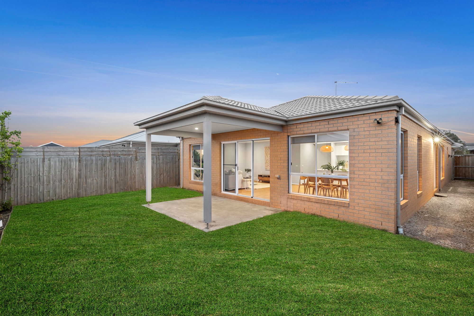 Outdoor: Undercover entertaining area/alfresco, concrete pad, grassed area, single side gate access, clothes line, external access to garage.