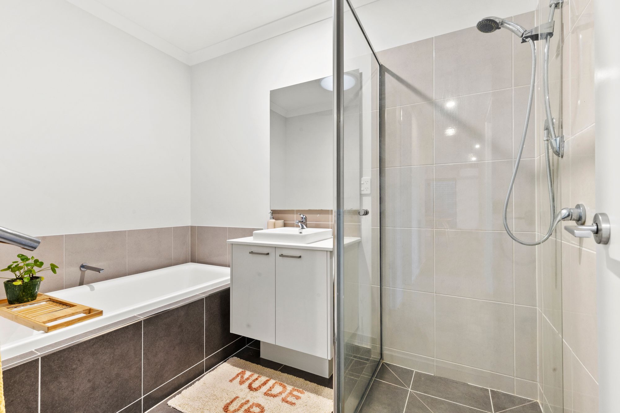 Main bathroom: single basin vanity with stone benchtops, semi frameless shower, handheld shower head, bathtub, tiling, chrome fittings & separate toilet