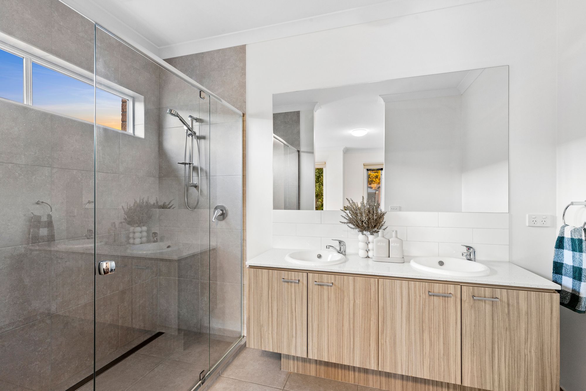 Master bedroom: Spacious, carpet, windows with roller blinds, ducted heating, walk in robe, Ensuite: expansive semi frameless shower, highlight window, upgraded fittings, twin feature basin with extended vanity, 20mm stone benchtop, extended mirror, towel rail, chrome fittings, toilet