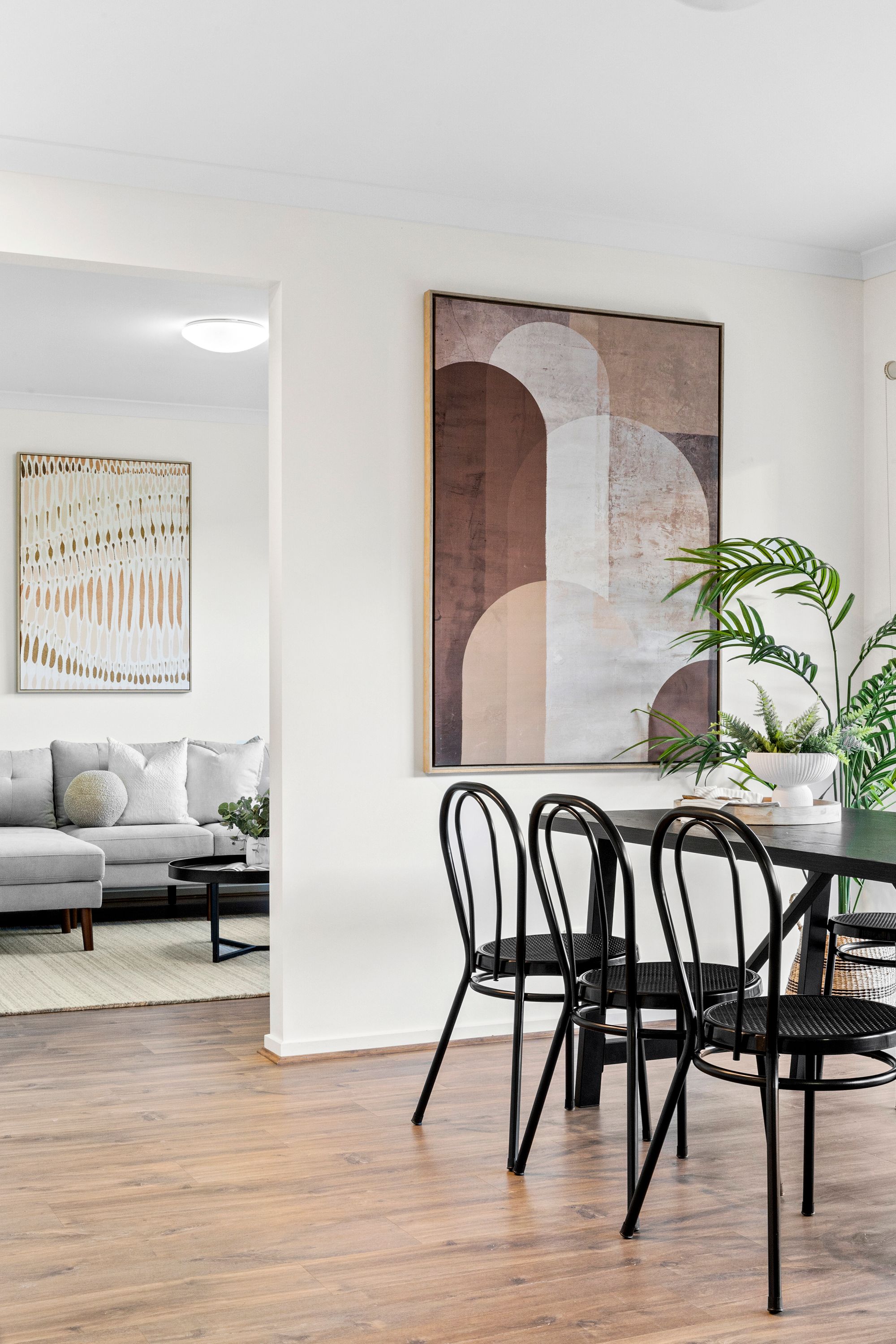 Living area: Open plan adjoining kitchen and living area, timber laminate flooring, large windows, roller blinds, ducted heating, glass stacker doors to undercover alfresco, modern colour scheme.