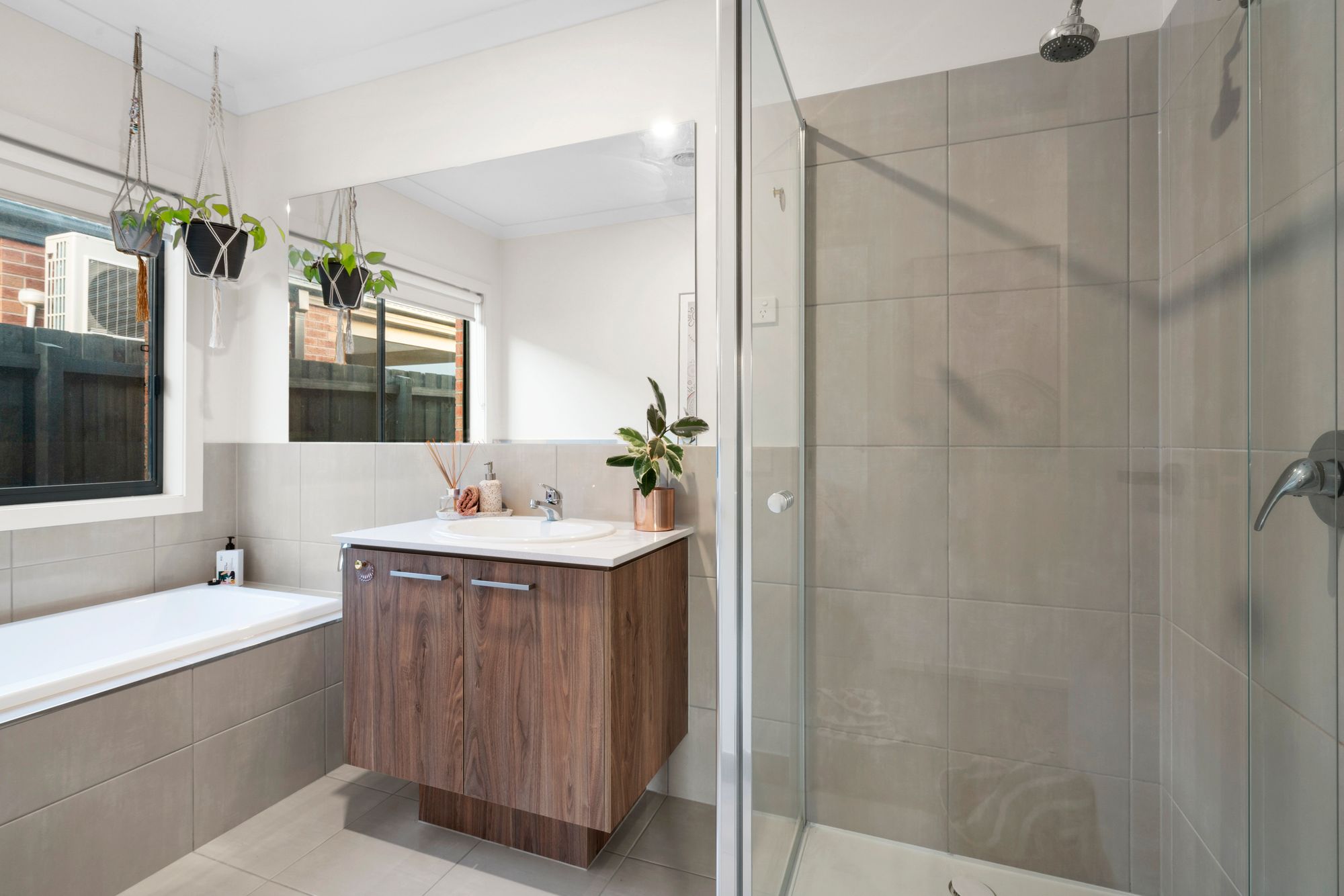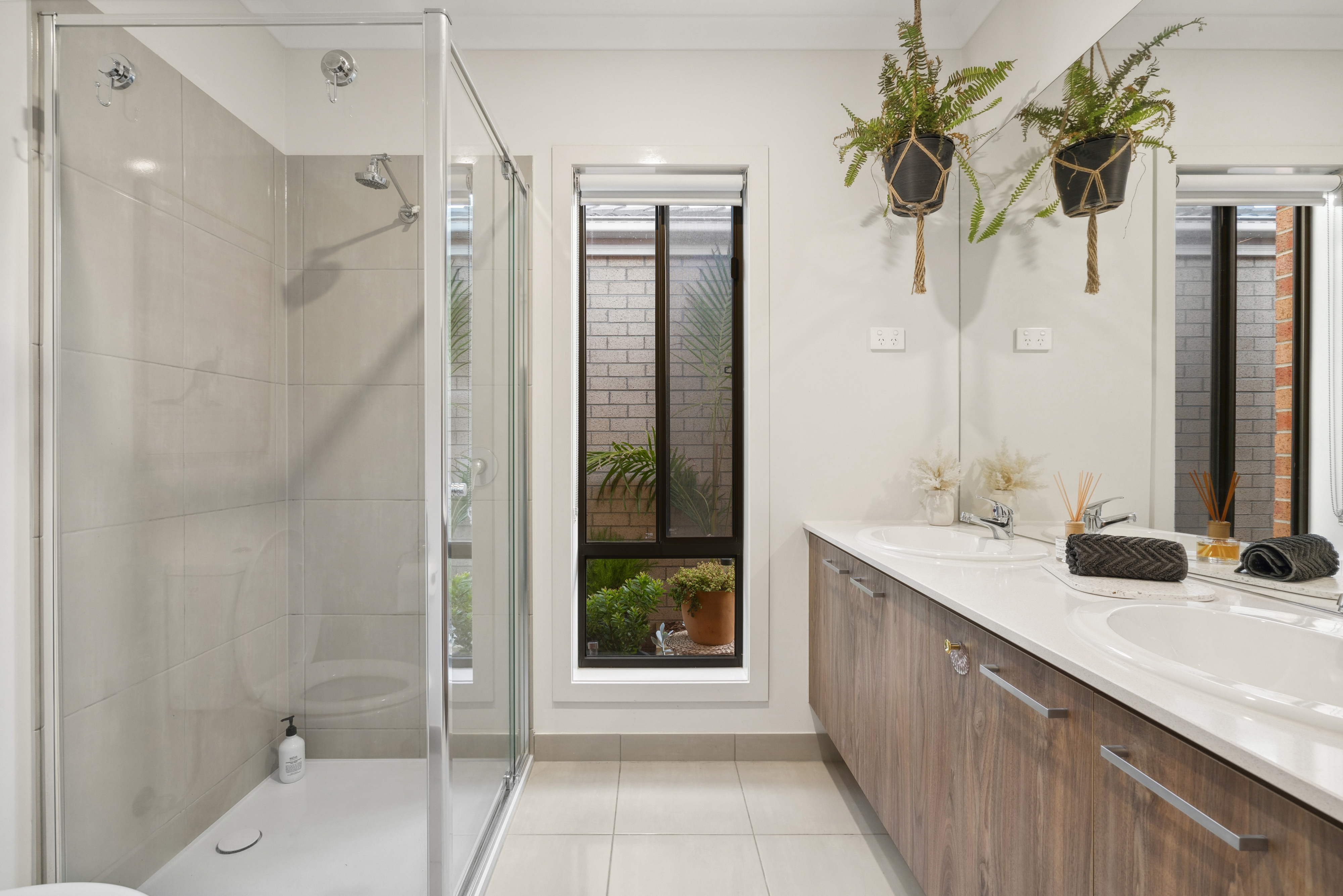 Ensuite: 20mm stone bench with double vanity, storage, expanded frame-less mirror, semi frame-less single shower with chrome fittings, tile flooring.