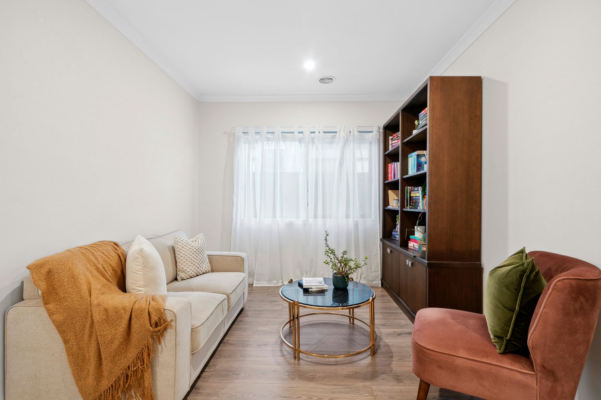 Second Living: Raised ceilings, ducted heating, downlights, windows with sheer curtains, timber laminate flooring.