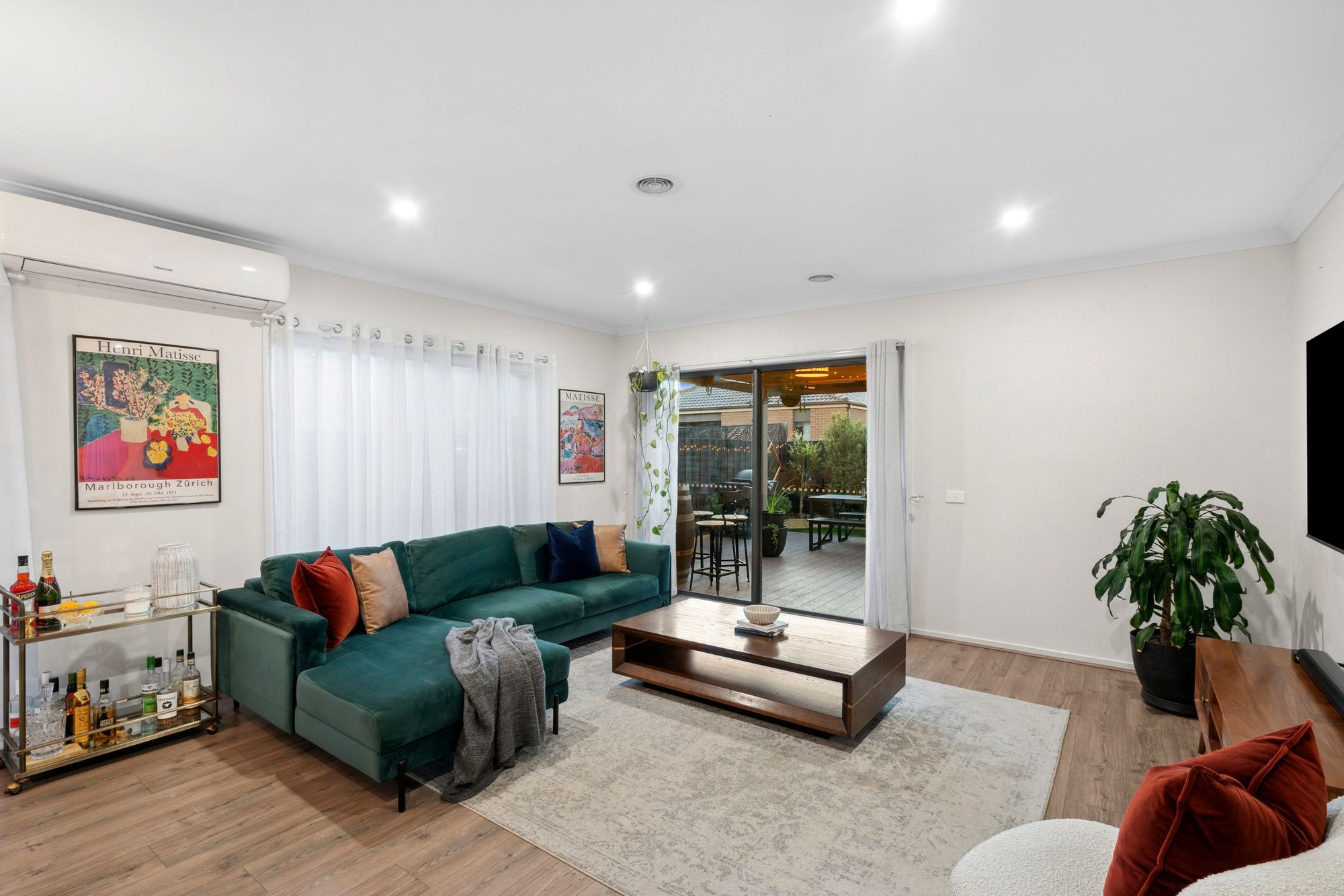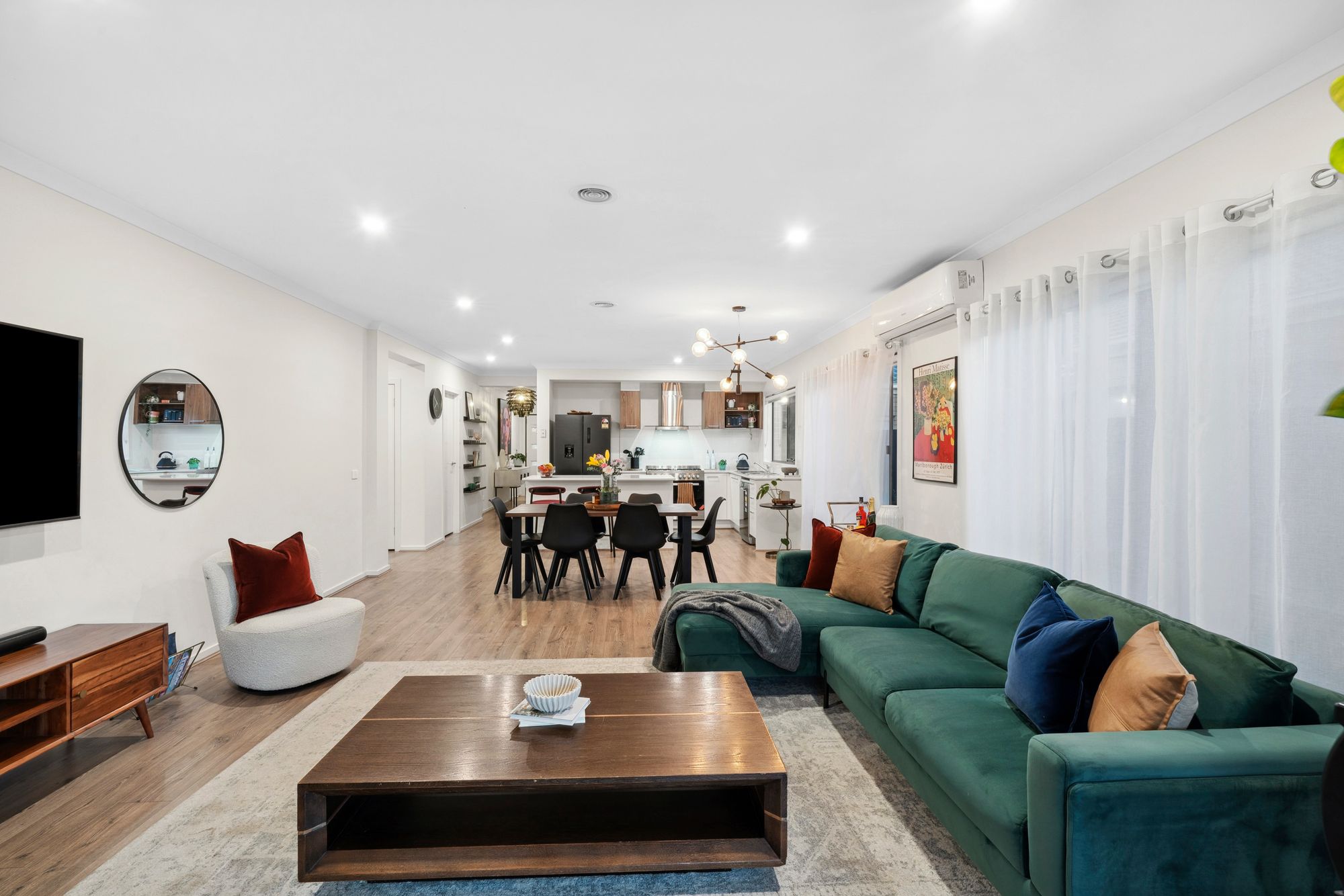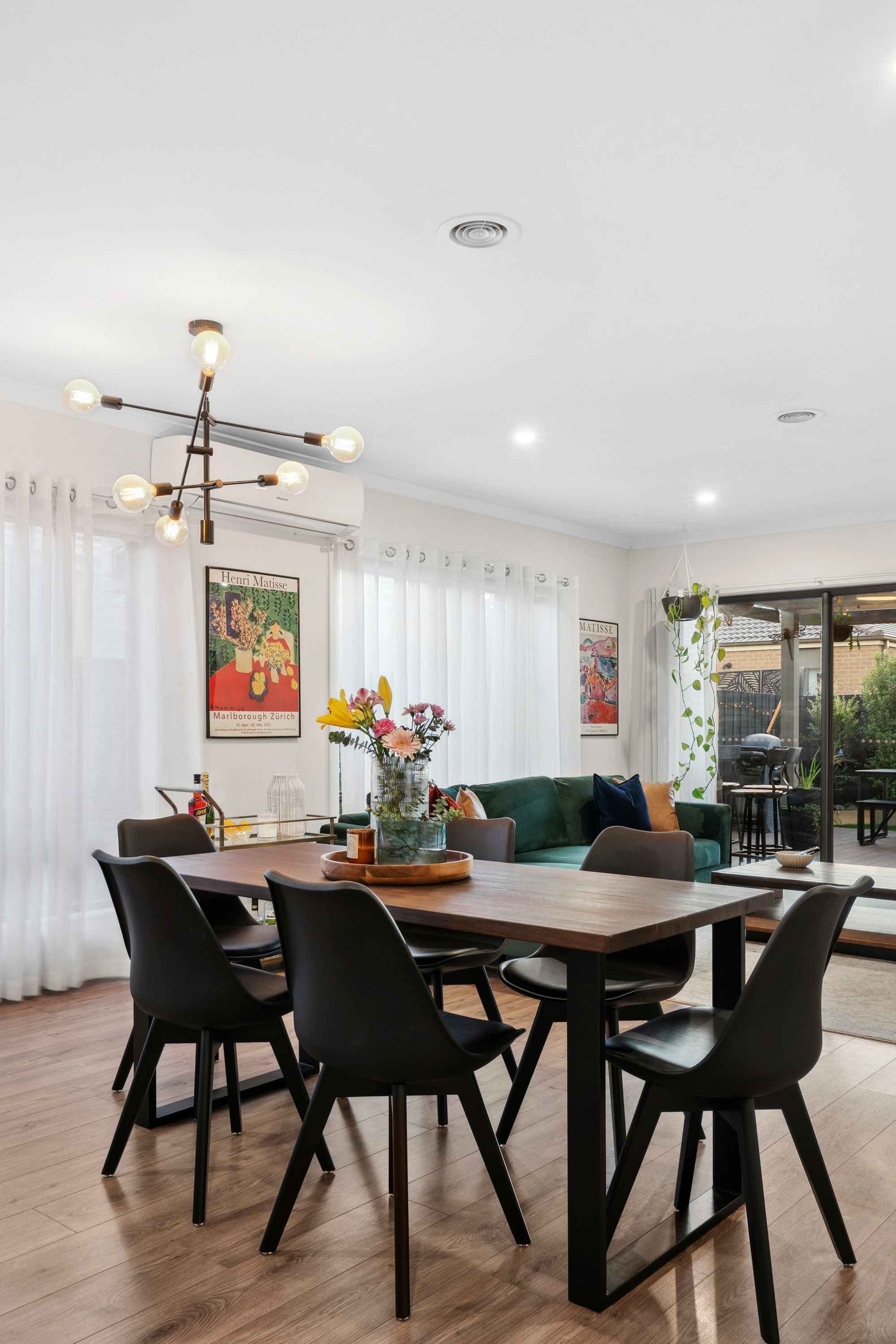 Living/Dining: Open plan living, raised ceilings, downlights, ducted heating, split system cooling, windows with sheer curtains, glass sliding door connecting outdoor entertainment area.