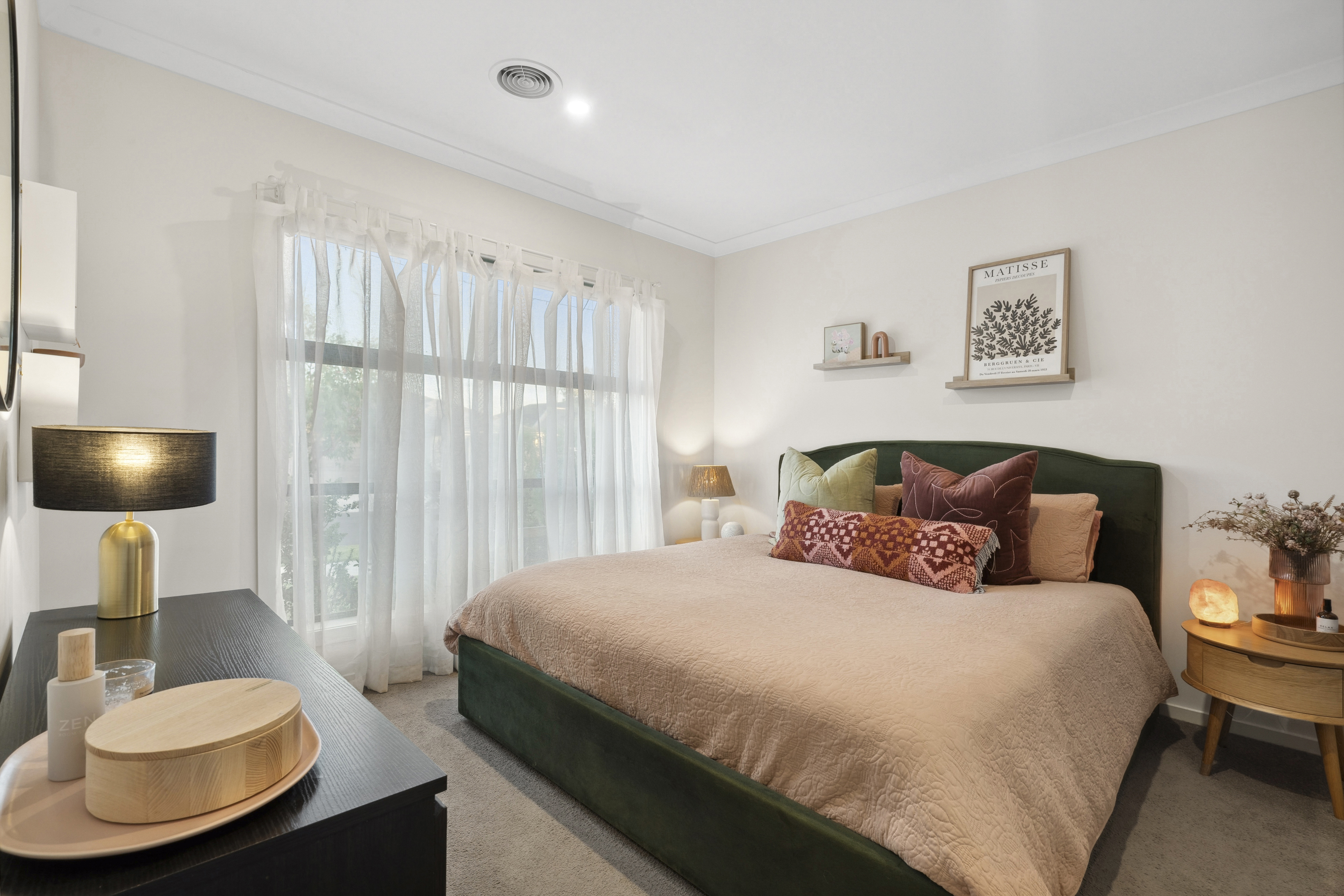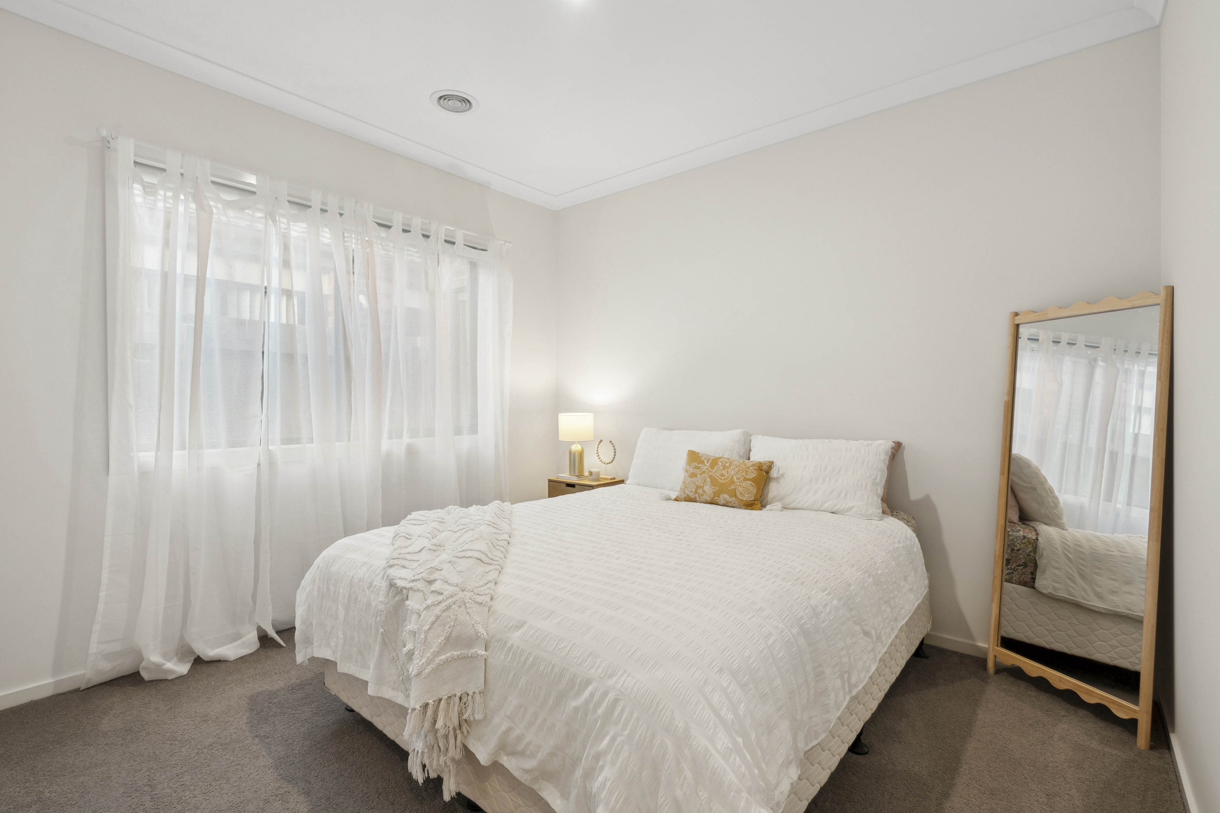 Master bedroom: Inviting size, carpet flooring, ducted heating, windows with sheer curtains, walk in robe.