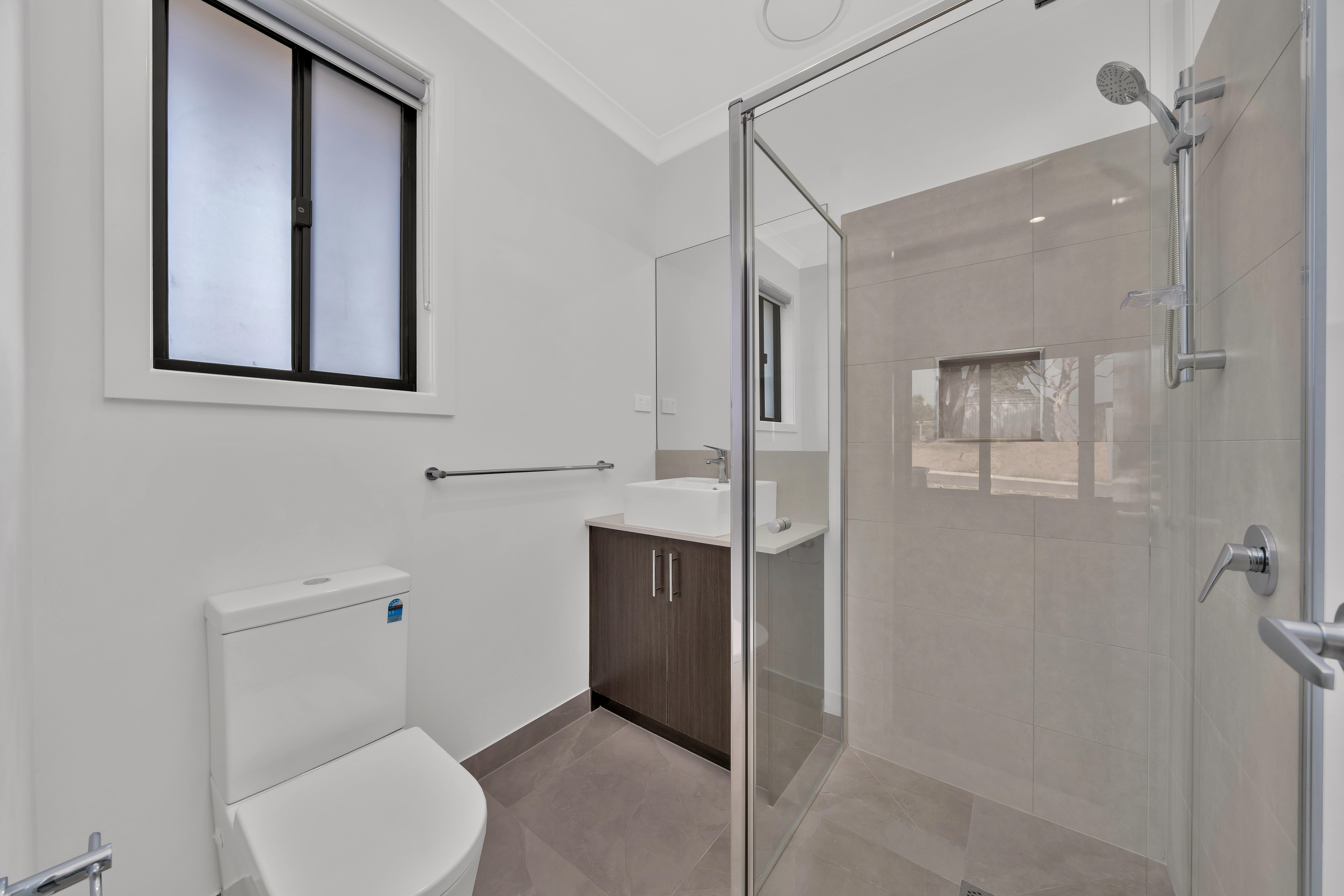Ensuite: 20mm stone benchtop fitted with a single vanity and chrome fittings, frame less mirror, single shower with niche, tile flooring, toilet, frosted windows with roller blinds.