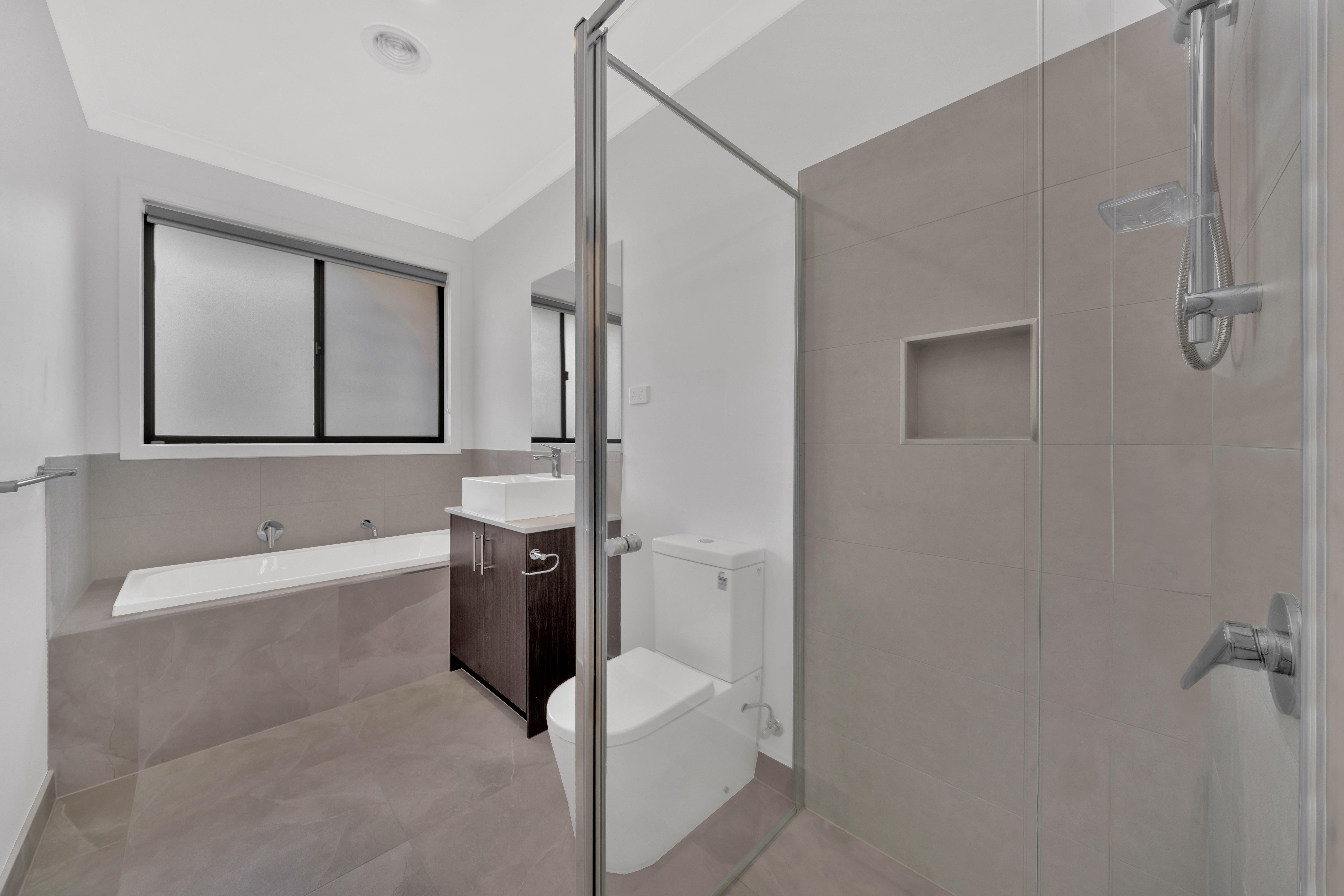 Main bathroom: 20mm stone bench fitted with a single vanity, frame less mirror, chrome fittings, single shower with niche, bath, frosted windows with roller blinds, towel rack.