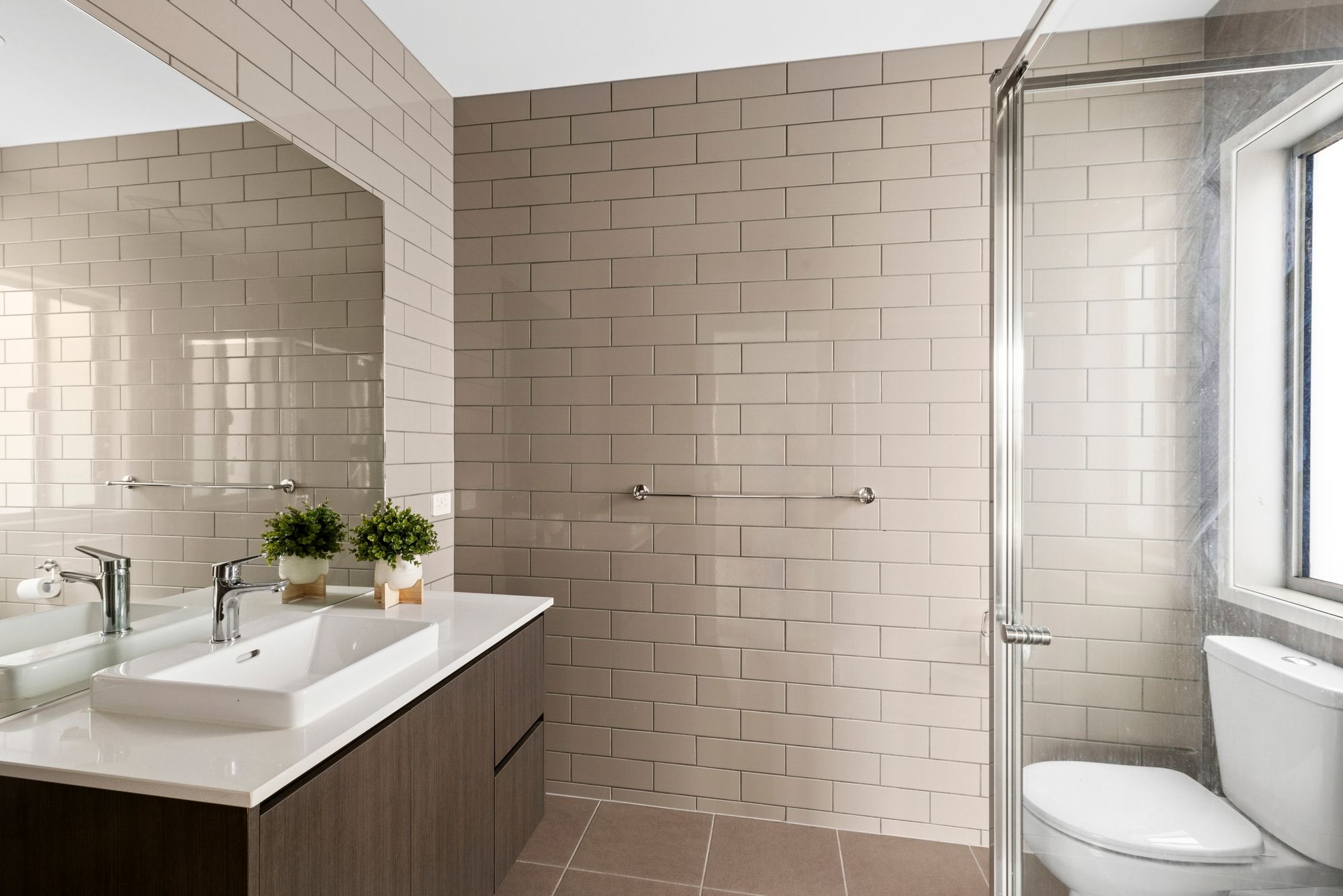Main bathroom: Basin & vanity with mirror, stone benchtop, bathtub, tiling, semi-frameless shower with handheld shower head & niche, separate toilet.