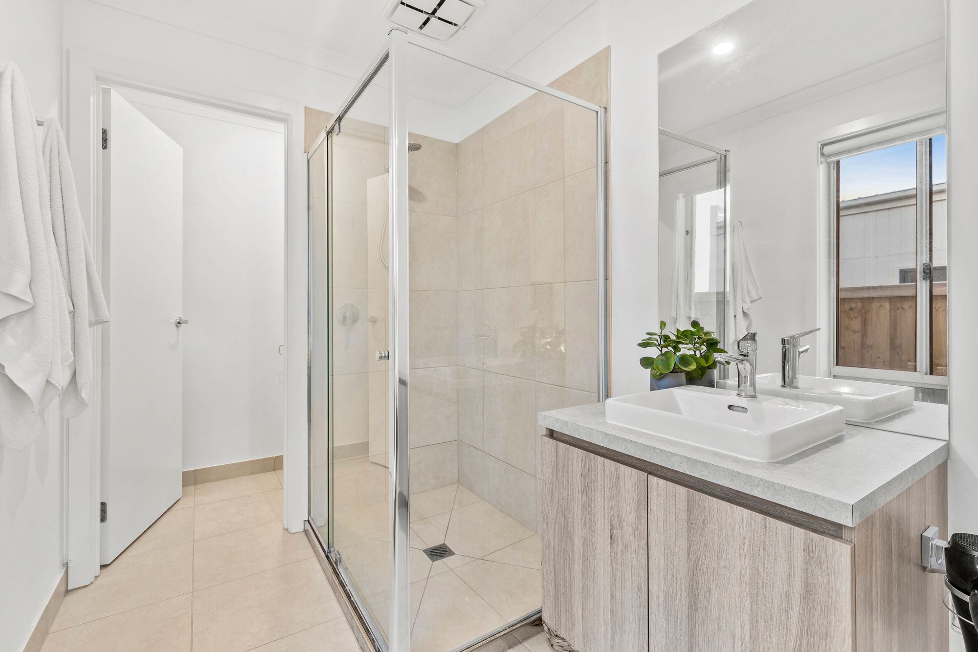 Ensuite – Large shower with wall mounted and handheld showerhead, single sink and vanity with ample storage, private toilet, large mirror splashback and chrome fittings.