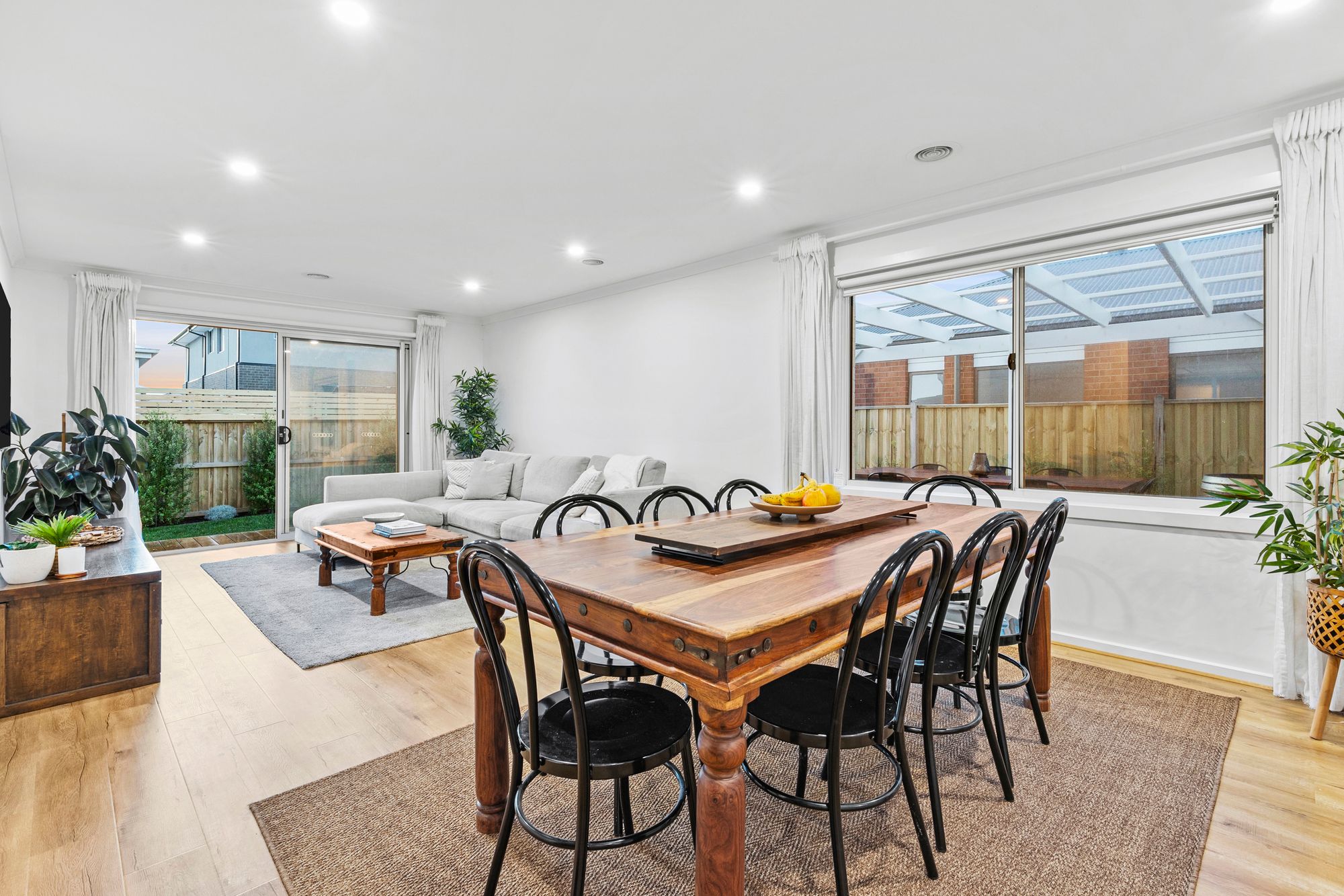 Dining – Large open plan kitchen/dining/living area with wide windows, sheer curtains and roller blinds as well as glass sliding door through to the outdoor living space, downlights, ducted heating, timber laminate flooring.