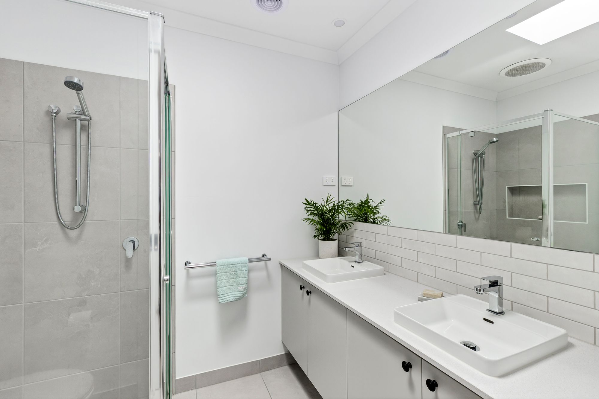 Master Bedroom: Carpet, plantation shutters, ducted heating, ceiling fan, walk-in robe, and downlights. Ensuite: semi-frameless shower with niche, dual vanity & basins, stone benchtop & tile splashback, large mirror splashback, skylight, chrome fittings and toilet.