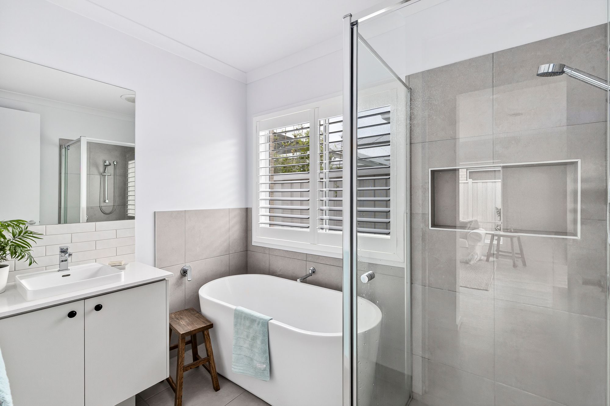 Main Bathroom: Semi-frameless shower with niche, free standing bath with swivel wall mounted tap, vanity & basin with large mirror splashback, tile splashback, plantation shutters, separate toilet.