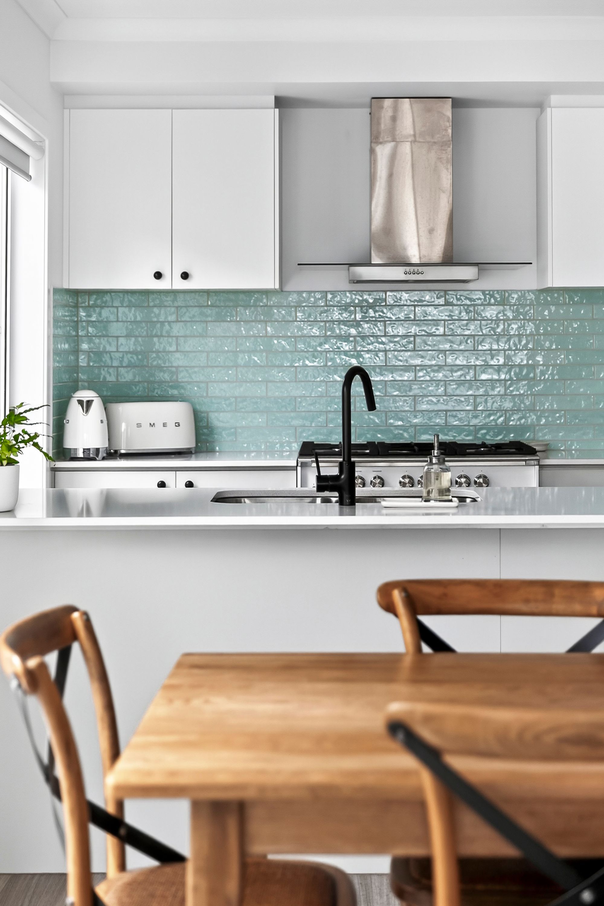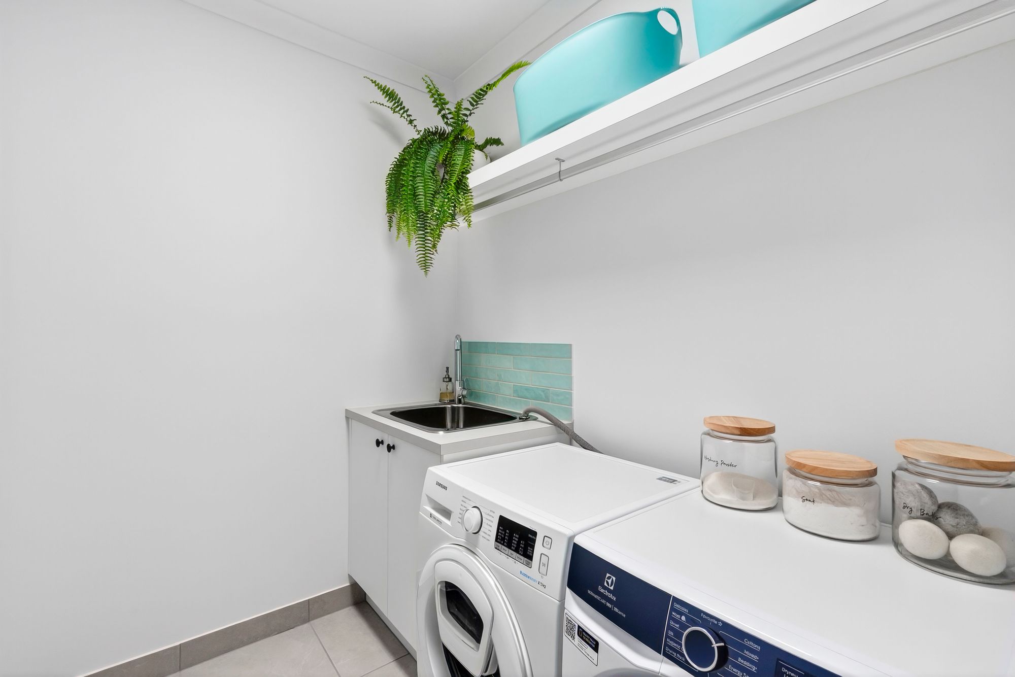 Kitchen: 20mm stone benchtops, island bench with breakfast bar, double undermount sink, matte black feature tapware & fittings, 900mm Fisher & Paykel oven, rangehood, microwave cavity, Miele dishwasher, feature coastal tile splashback, overhead cabinetry, soft close cabinetry & drawers, walk-in pantry, roller blinds, vinyl flooring & additional downlights.