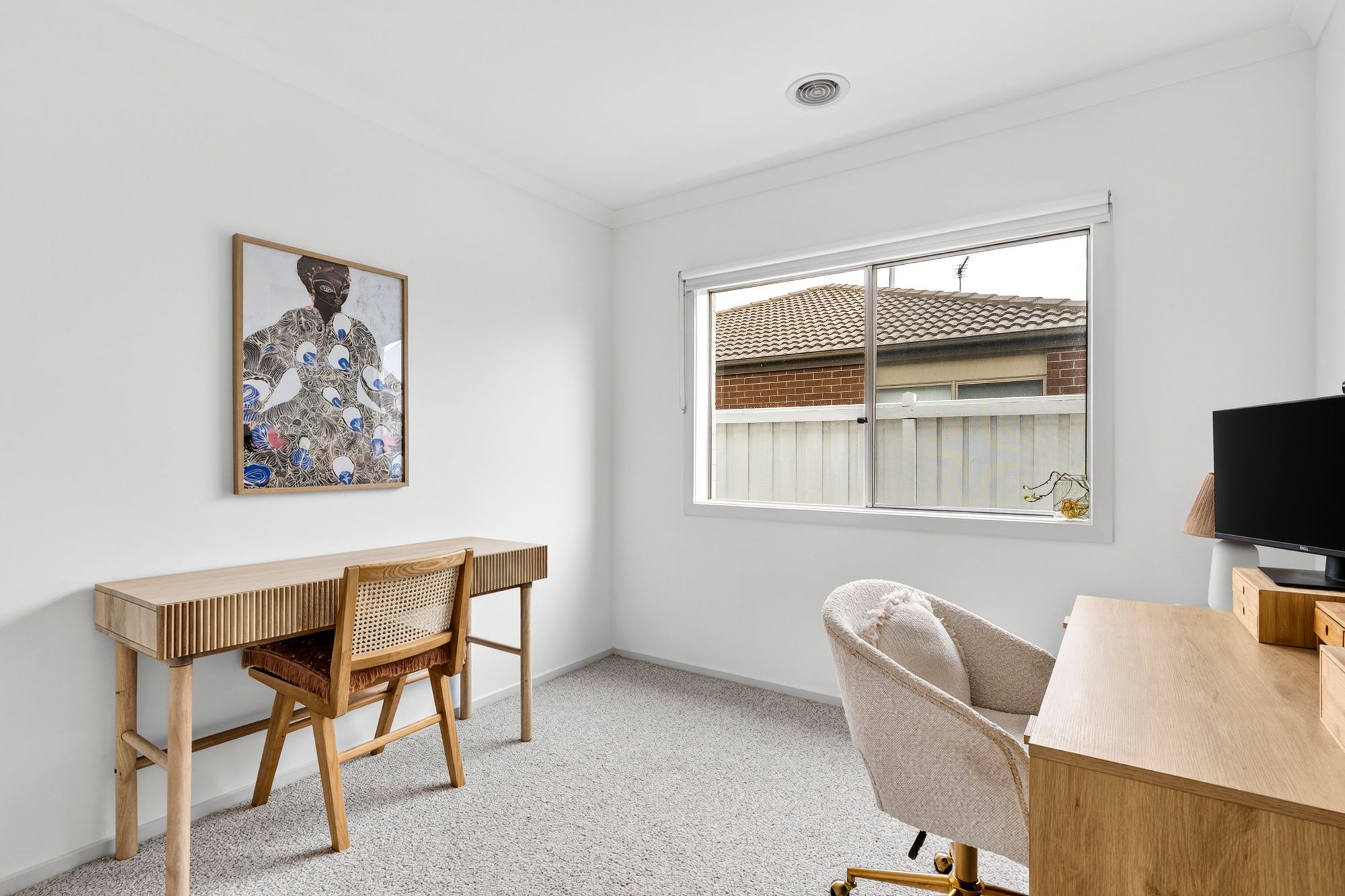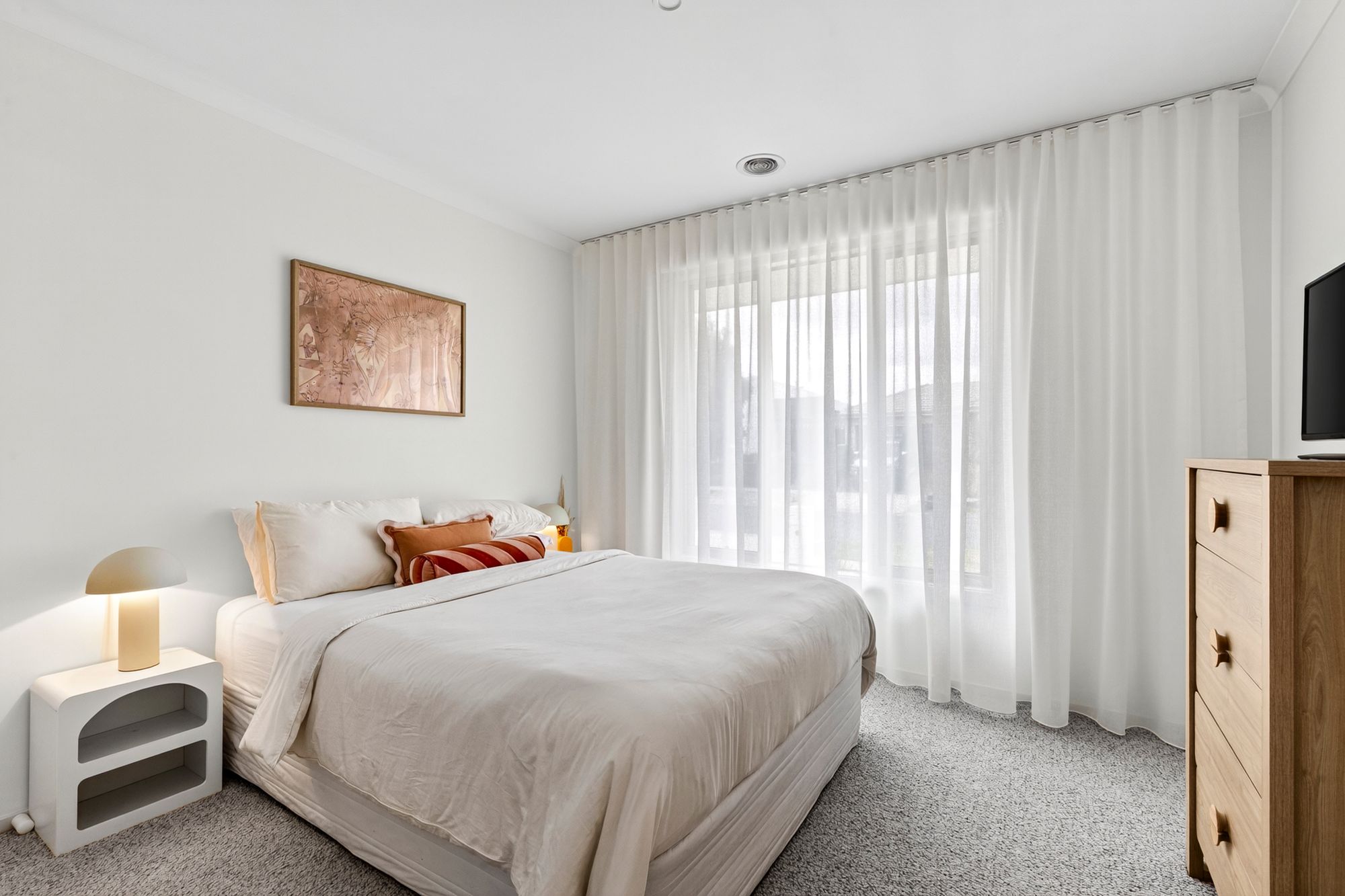 Minor Bedrooms – Synthetic wool carpet with upgraded underlay, high ceilings, ducted heating, roller blinds, built-in wardrobes, multiple power points (Front minor bedroom includes floor to ceiling sheer curtains and awning windows).
