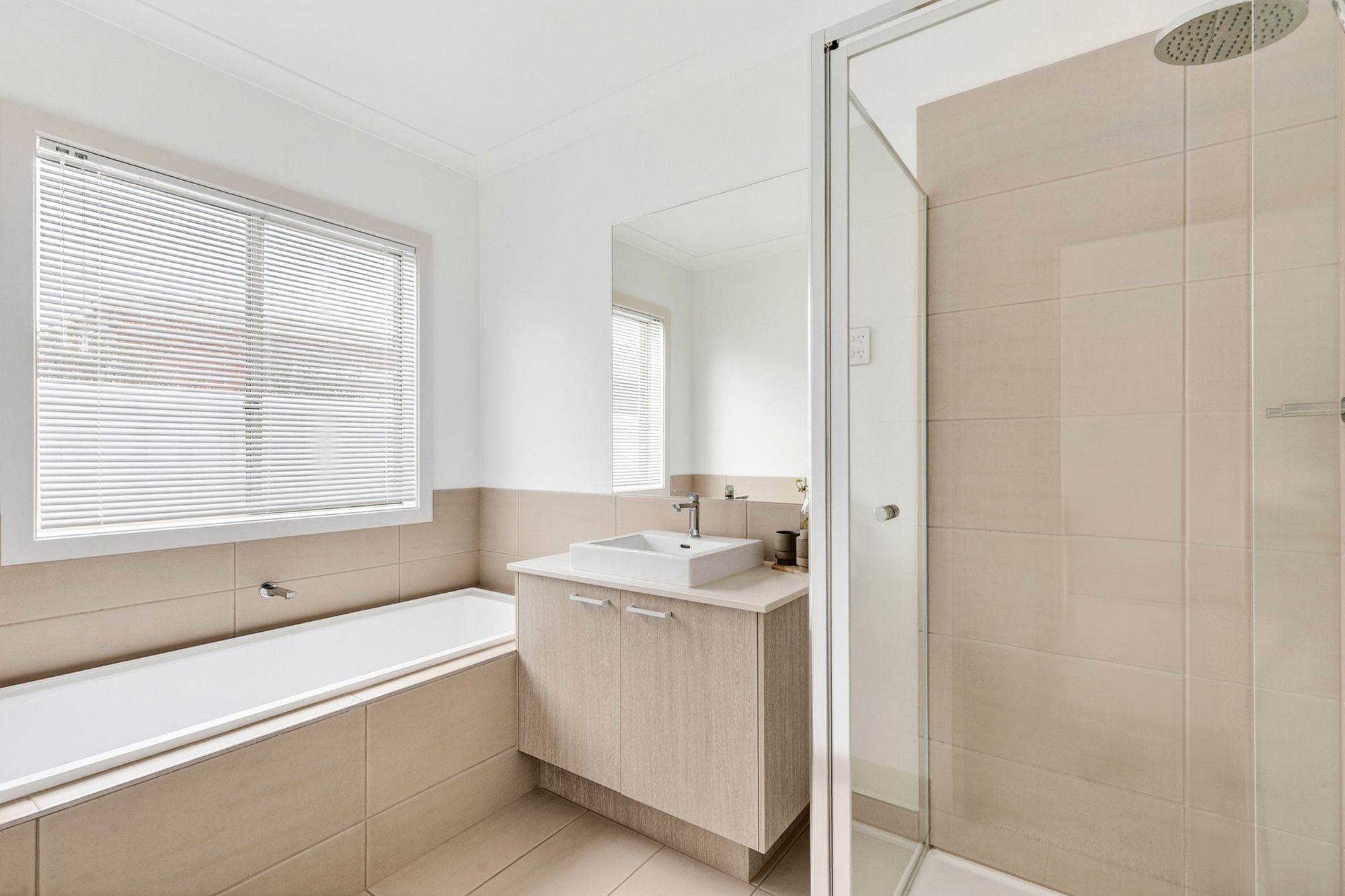 Main Bathroom – Tiled, single vanity with basin, mirror splashback, semi-frameless shower, tiled in bath, ceiling light, multiple power points, and separate toilet.