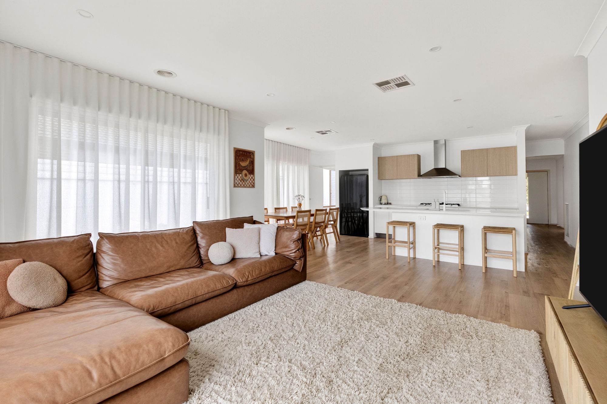 Living / Dining – Open-plan, Hybrid vinyl floorboards, downlights, evaporative cooling, ducted heating, floor to ceiling sheer curtains throughout, roller blinds, high ceilings, TV & data points, power points, glass sliding door to outdoor entertaining and backyard.