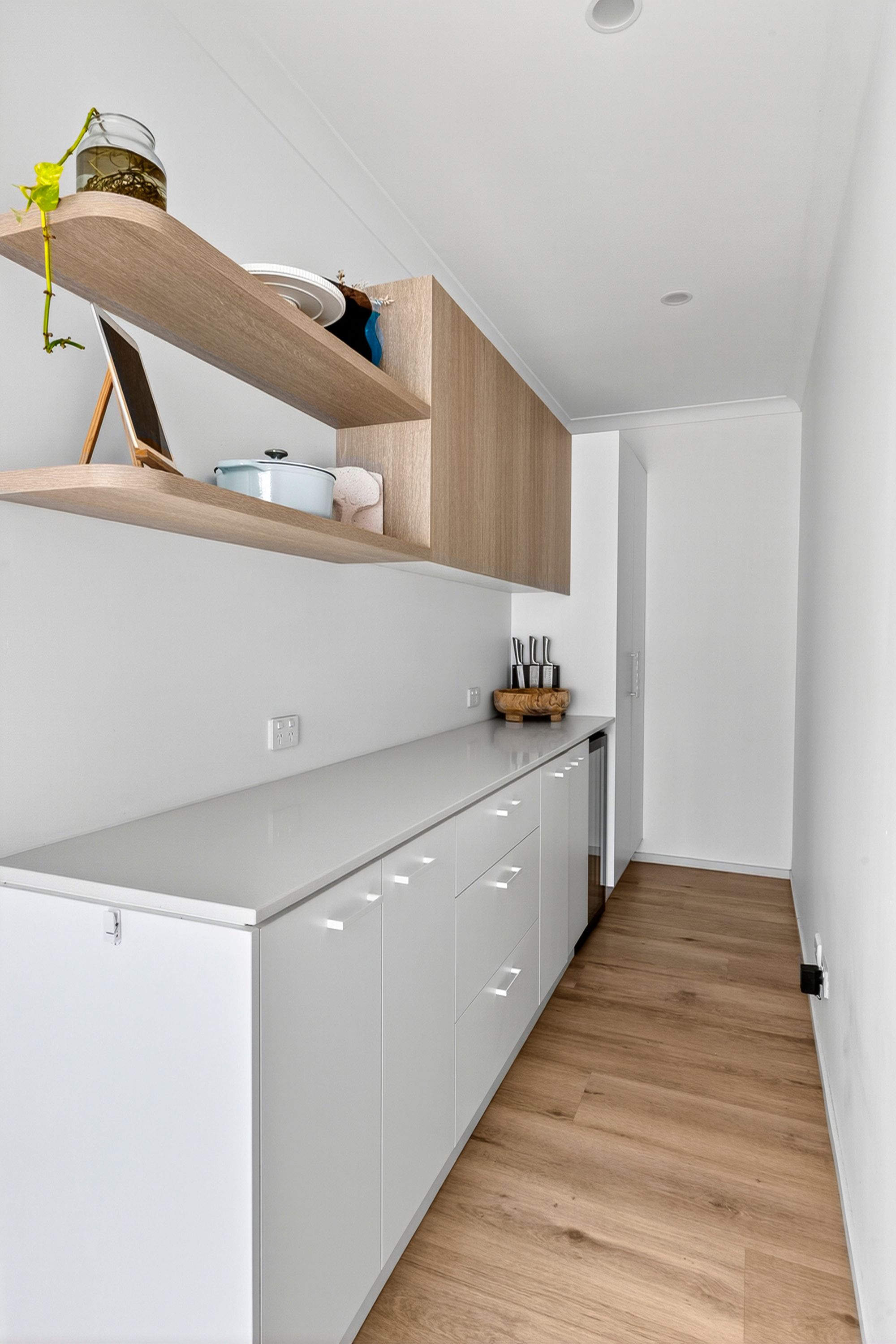 Kitchen – Hybrid vinyl floorboards, 20mm stone benchtops, custom curved stone island bench with breakfast bar overhang, 900mm integrated gas cooktop/oven & rangehood, dual undermount sink with feature faucet, dishwasher, tiled splashback, generous fridge cavity, downlights, feature décor alcove. Large walk-in pantry; 20mm stone benchtop, downlights, ample custom made storage (pot-draws/cupboards/shelving), bar fridge cavity, multiple power points and easy garage access.