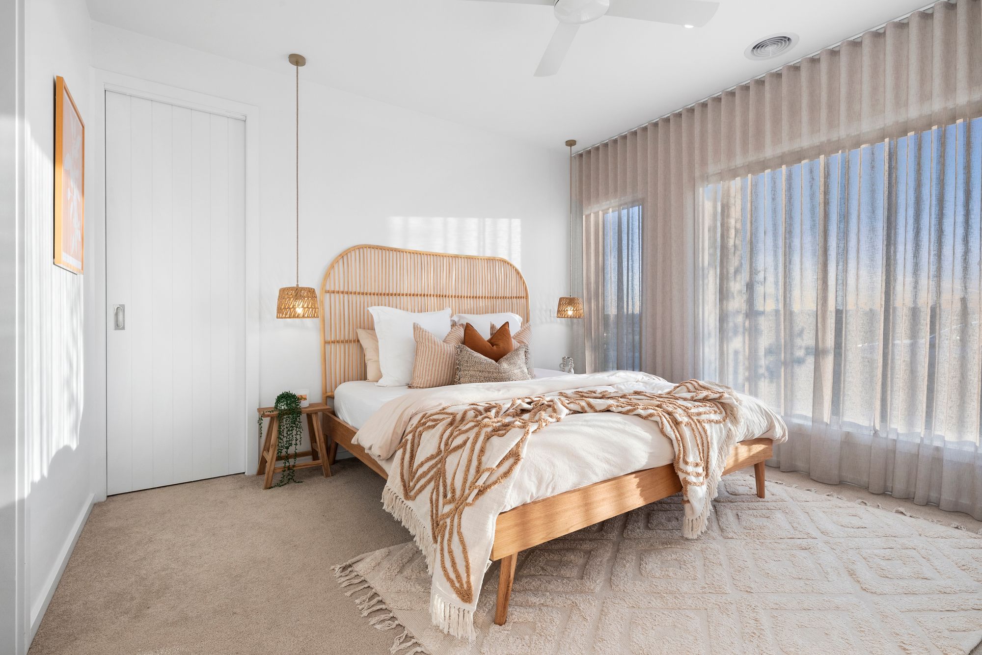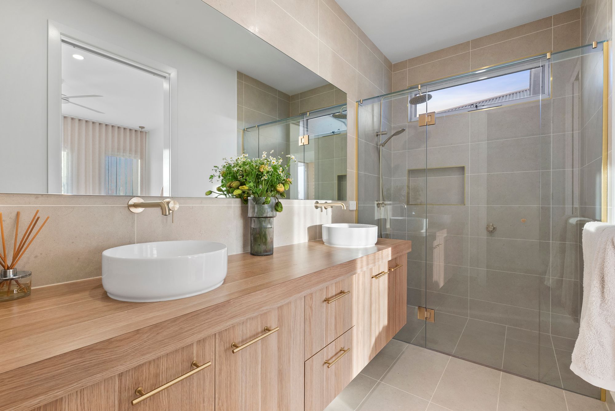 Master suite: high grade carpet & underlay, down lights & bedside feature lighting, ducted heating, evaporative cooling, ceiling fans, roller blinds with feature sheer curtains, grand walk in robe with custom top-to-toe fit-out including shelving/ draws/ hanging space, luxurious ensuite with full height wall tiles, expansive mirror, gold fixtures and fittings, extended tiled double shower with shower shelf & double shower head, large extended laminate bench tops with dual basins, ample storage and separate toilet