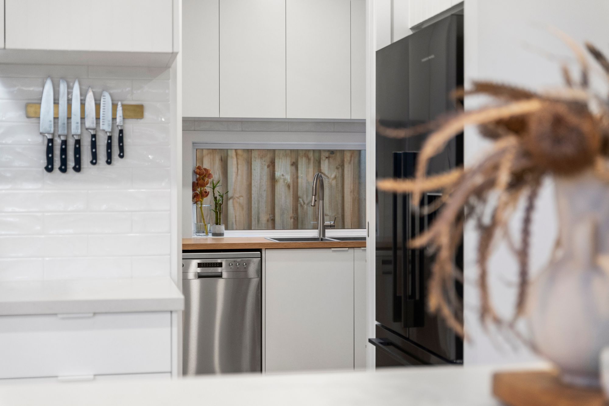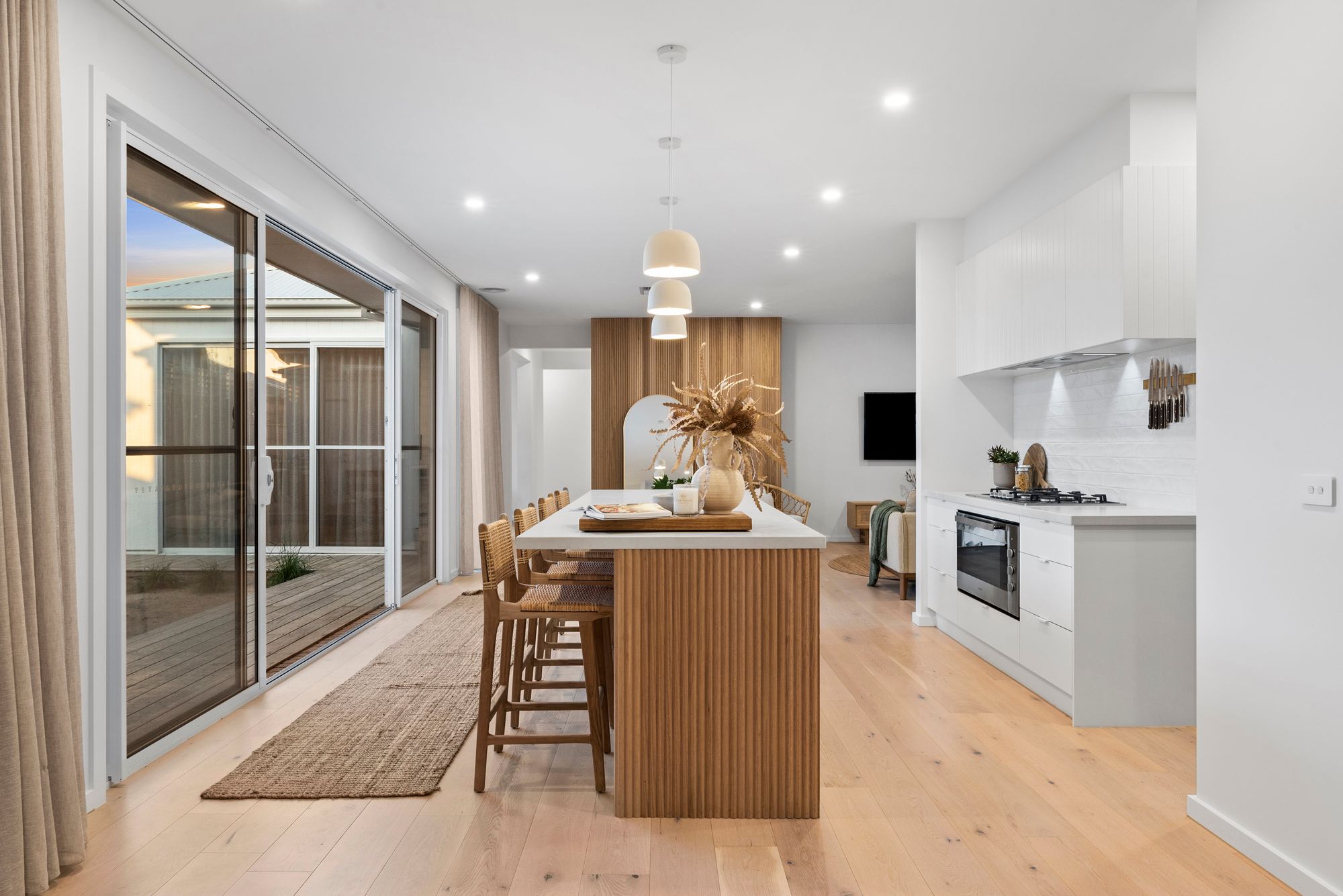 Kitchen: 40mm stone bench tops with island breakfast bar and feature timber paneling, 900mm stainless steel oven and gas cook top, feature tile splashback, stunning pendant lighting, additional downlights, dishwasher, dual under-mount sink relocated off island bench for ultimate entertaining space, abundant overhead cabinetry & drawers throughout, soft close to all kitchen drawers, storage extends through to the butlers pantry with additional storage & shelving, large window splash back creating ample natural lighting, microwave provision, timber laminate flooring