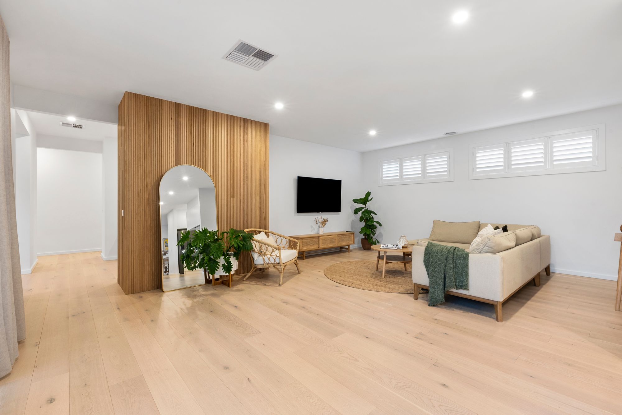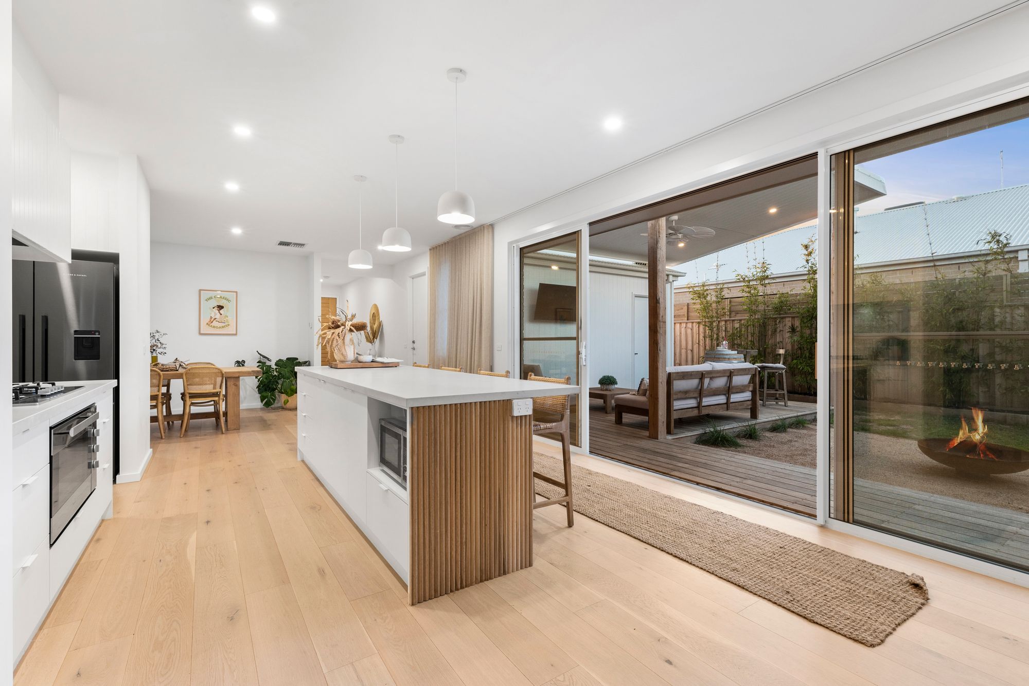Living/dining: wide hallway from entry, open plan kitchen/living/dining, raised ceilings creating a grand feel, feature wall timber paneling, square set cornices, downlights, ducted heating, ample natural sunlight, timber laminate flooring, high quality floor to ceiling sheer curtains, shutters, large glass stacker doors to side yard & undercover outdoor alfresco creating an indoor/ outdoor flow