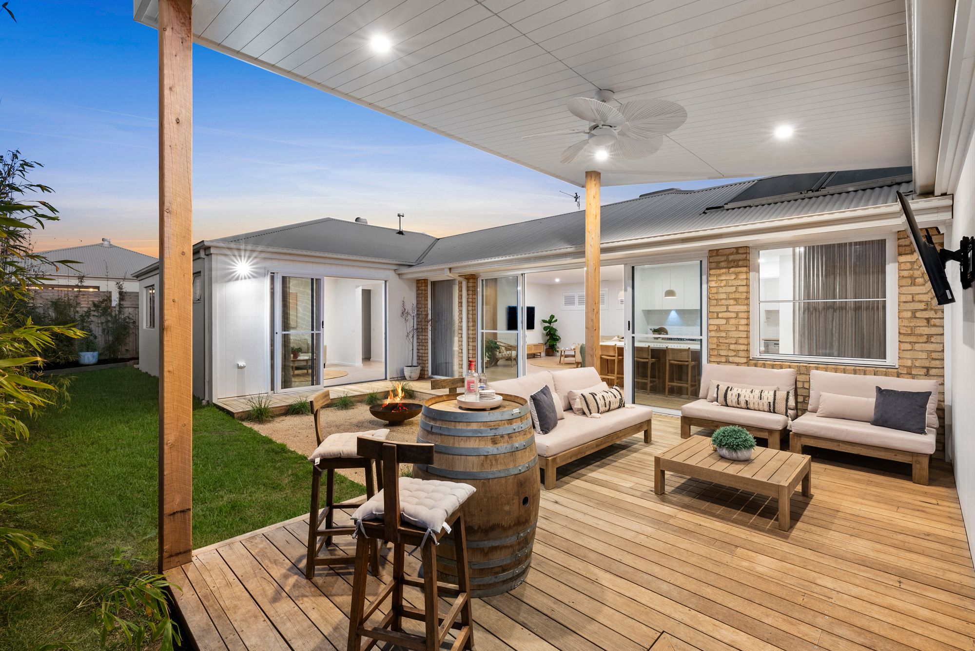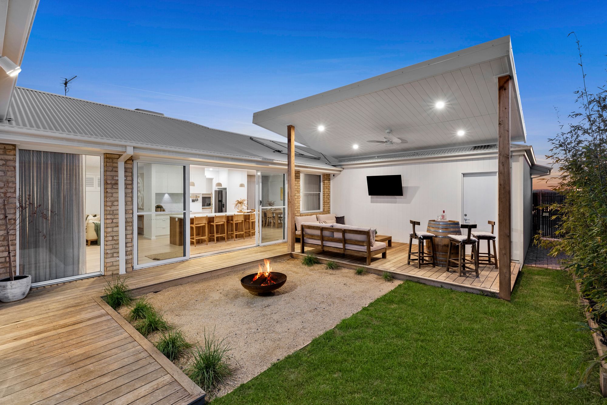 Outdoor: Coastal facade, elegant & low maintenance landscaping, aggregate concrete driveway, backyard undercover alfresco with decking extending around the outdoor living with downlights and ceiling fan, side-gate access, well-maintained grass area, fire pit area