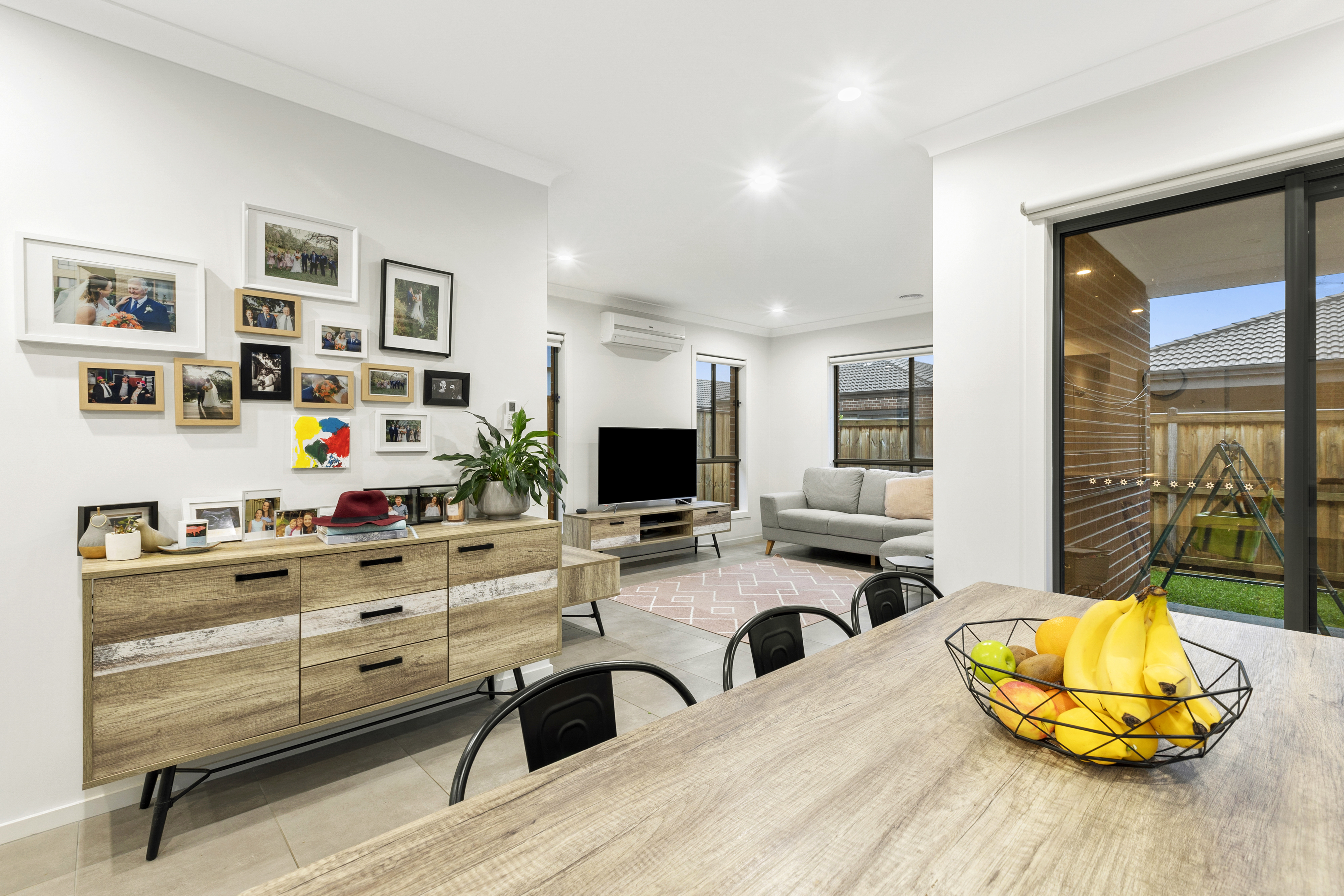 Living: down lights, tiles, roller blinds, ducted heating, split system cooling, sliding doors