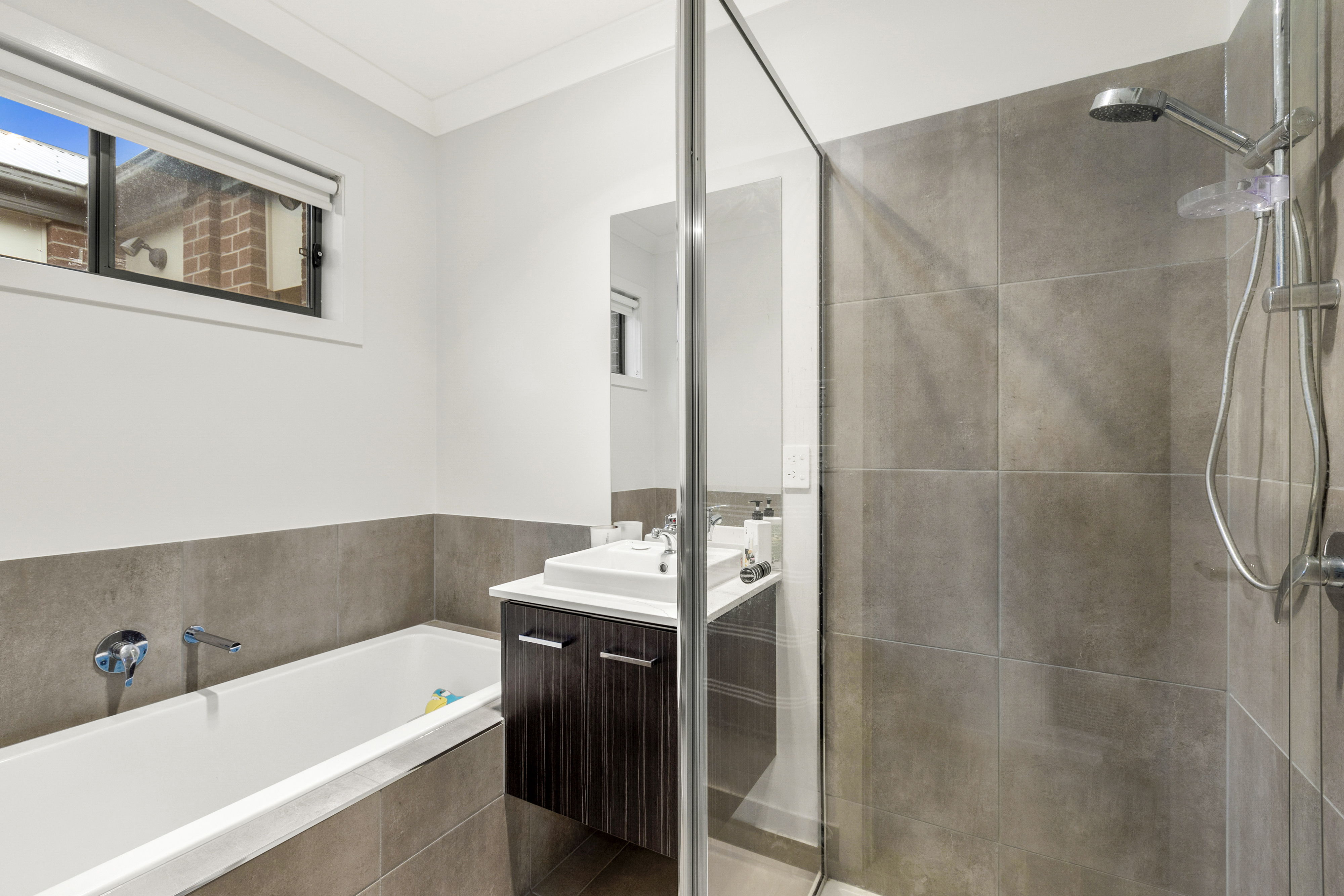 Main bathroom: stone benchtop, chrome fittings, mirror splash back, single vanity, semi frameless shower, hand held shower head, bath, separate toilet