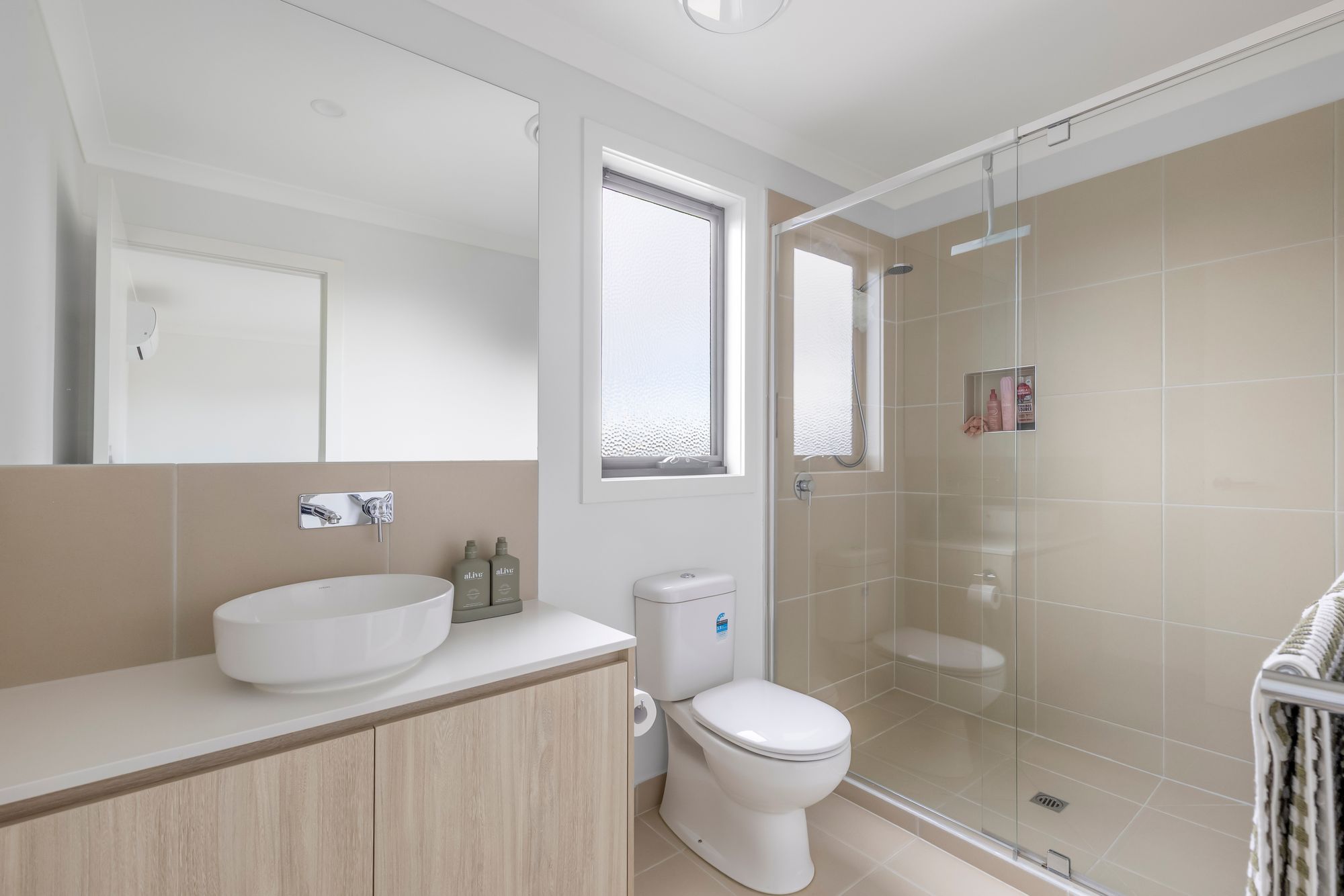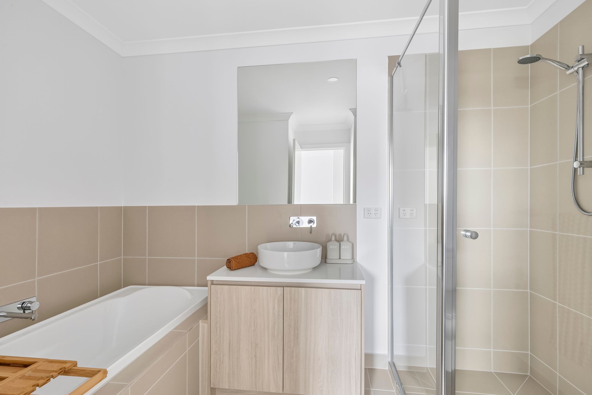 Main Bathroom – Features a shower, bath, feature vanity with a 20mm stone benchtop, ample storage and chrome fittings.