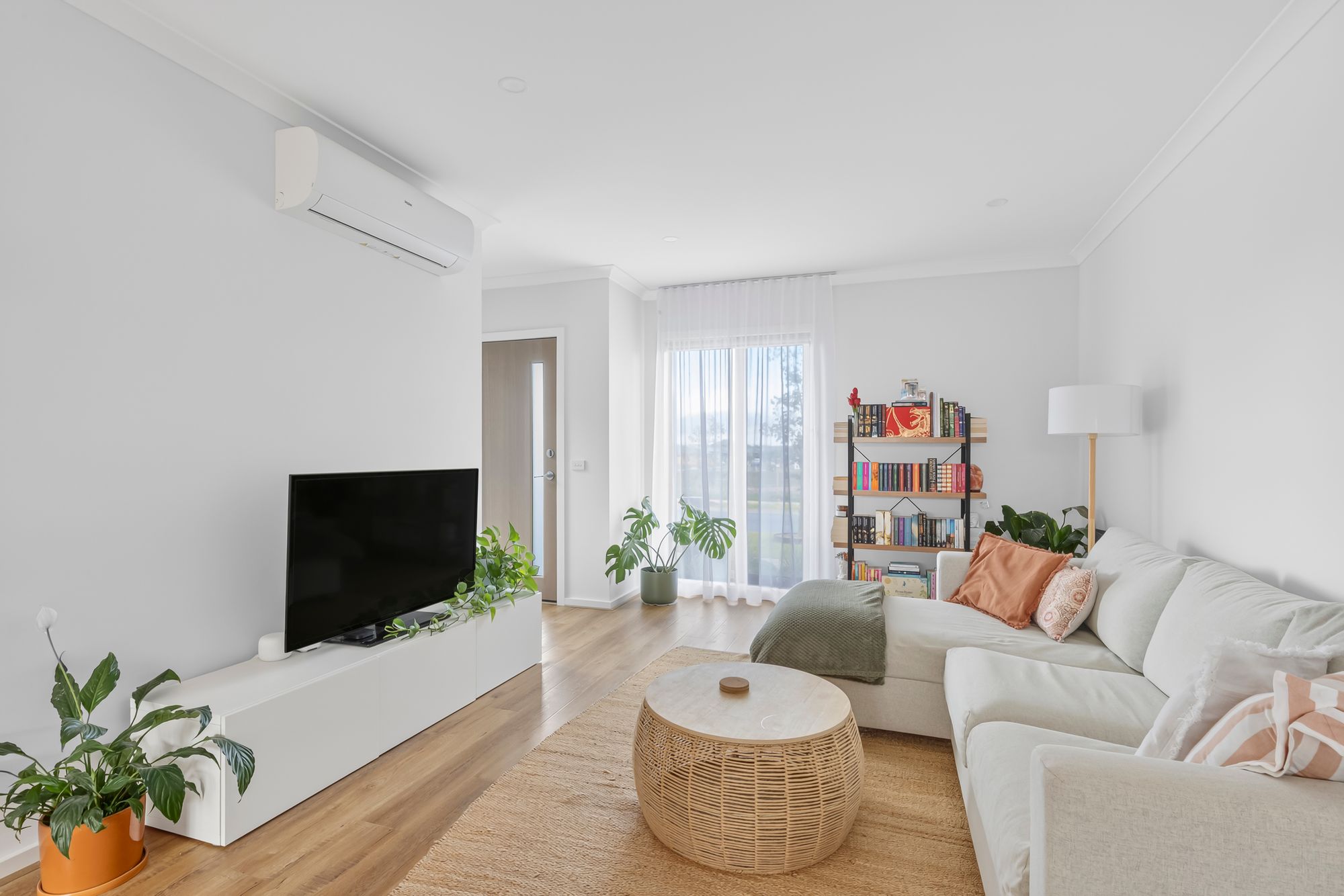 Main Living Area – Located at the front of the home and integrated with the kitchen and dining areas. Features include timber laminate flooring, large windows with roller blinds, sheer curtains, and split-system air conditioning.
