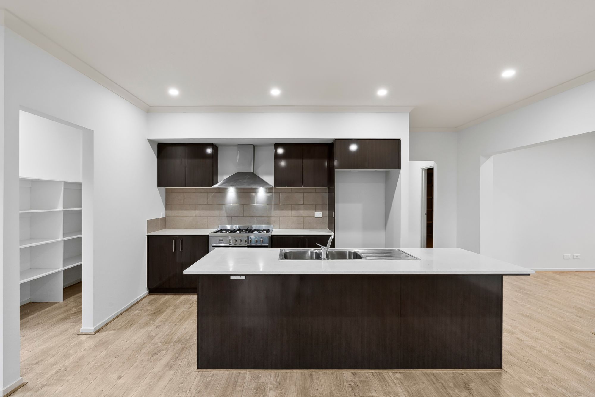 An open-plan kitchen complete with a generous walk-in pantry with shelving providing plenty of storage space, a fantastic-sized fridge cavity, 20mm stone benchtop with breakfast bar overhang, double stainless steel sink, 900mm free-standing cooktop oven, gas ducted heating, high ceilings, downlights, roller blinds, feature tiled splashback, microwave cavity, and dishwasher.