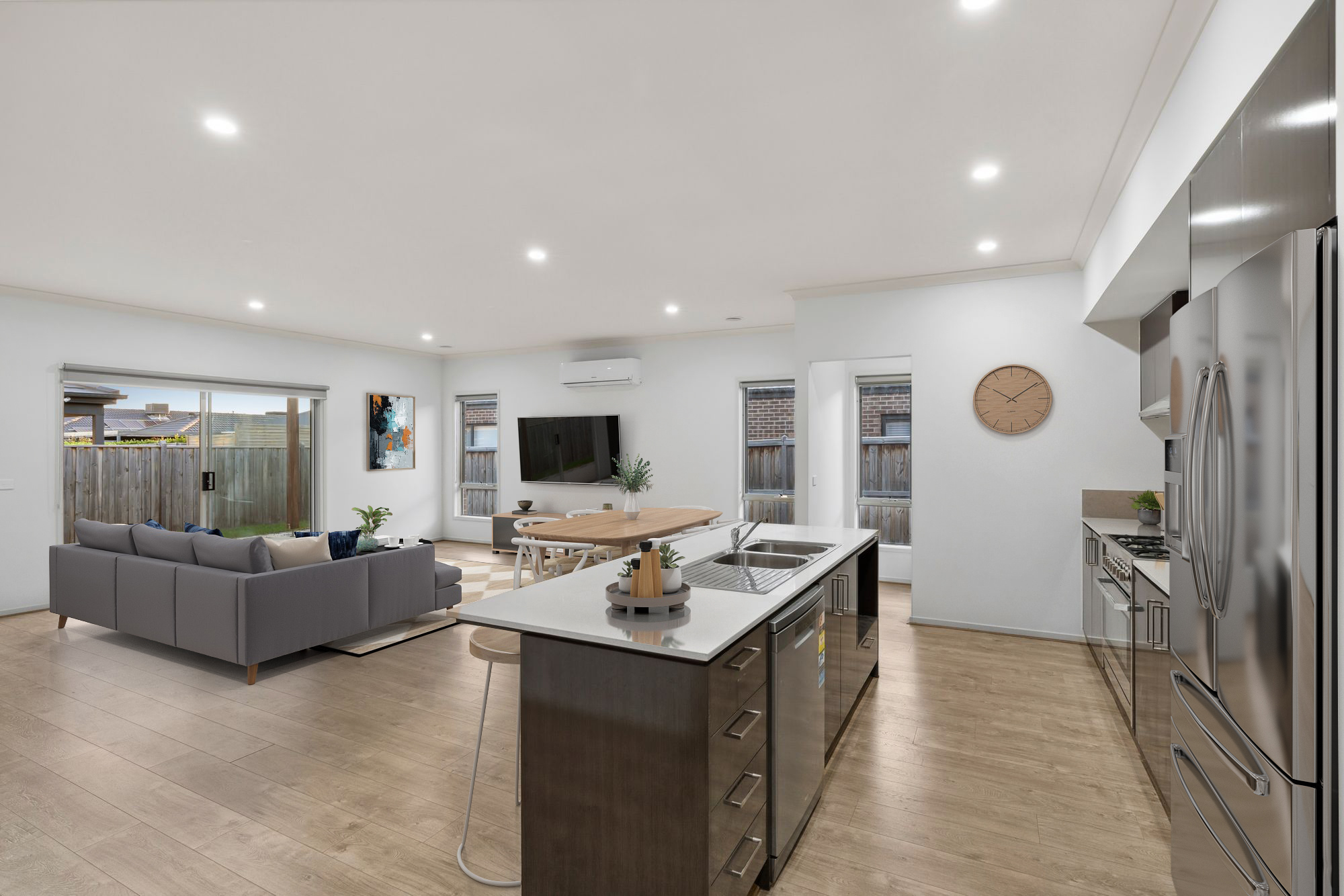 Expansive open-plan kitchen/living/dining, high ceilings, ducted heating & split system heating/cooling, downlights throughout, timber laminate flooring, sliding glass doors open to outdoor alfresco, creating indoor/outdoor flow