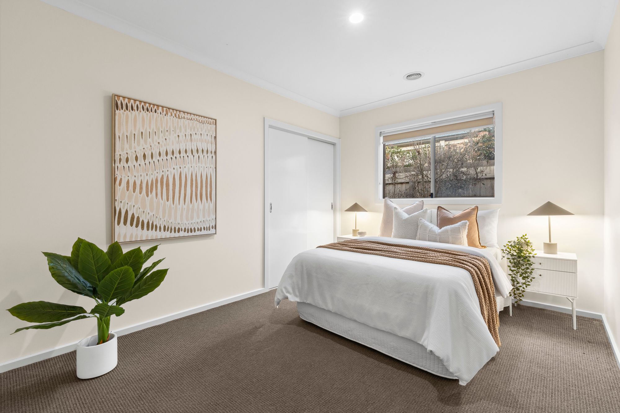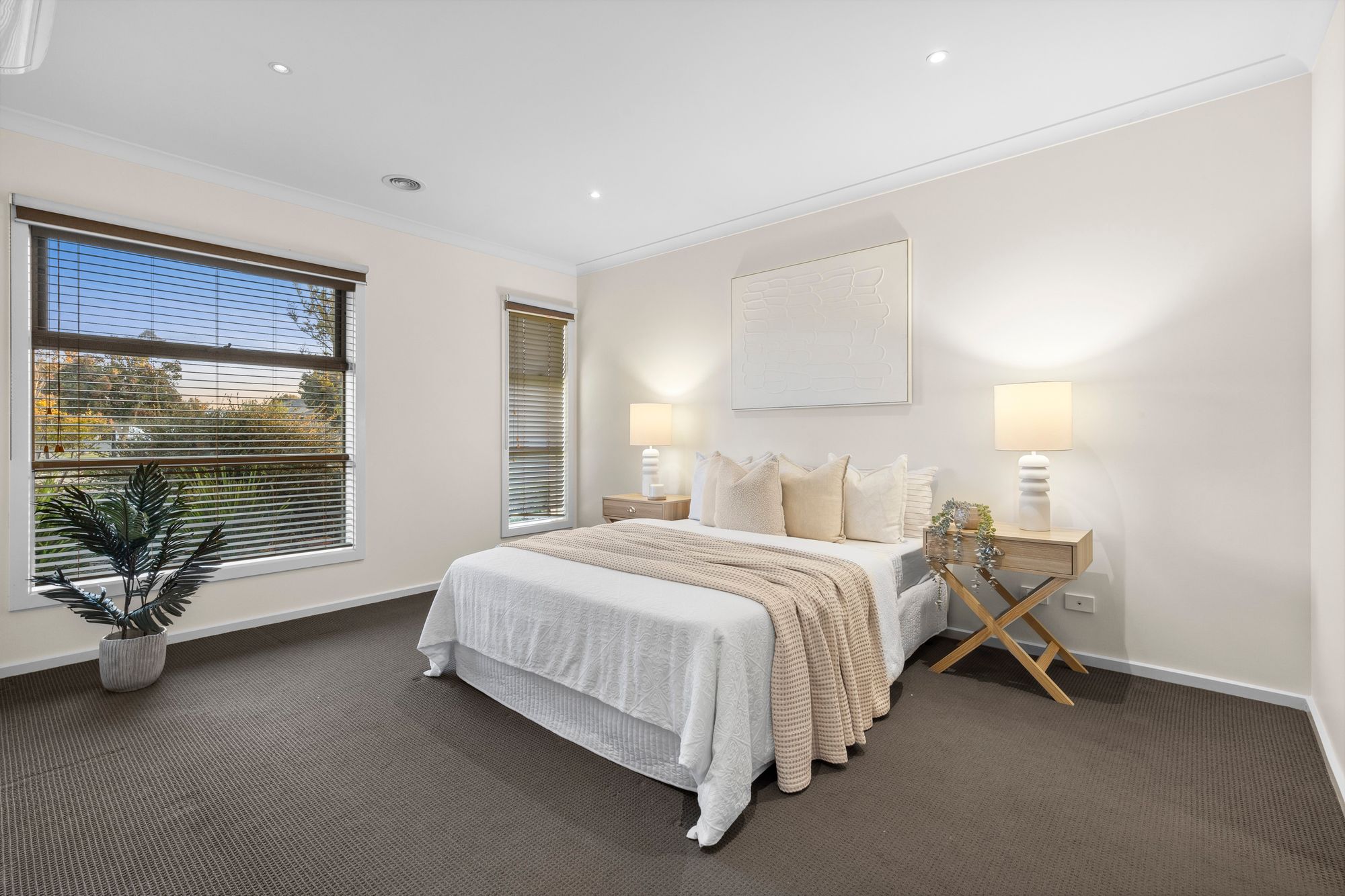 Master bedroom: New carpet, downlights, roller blinds, dual walk-in-robes with sliding door access, ducted heating, split system cooling.