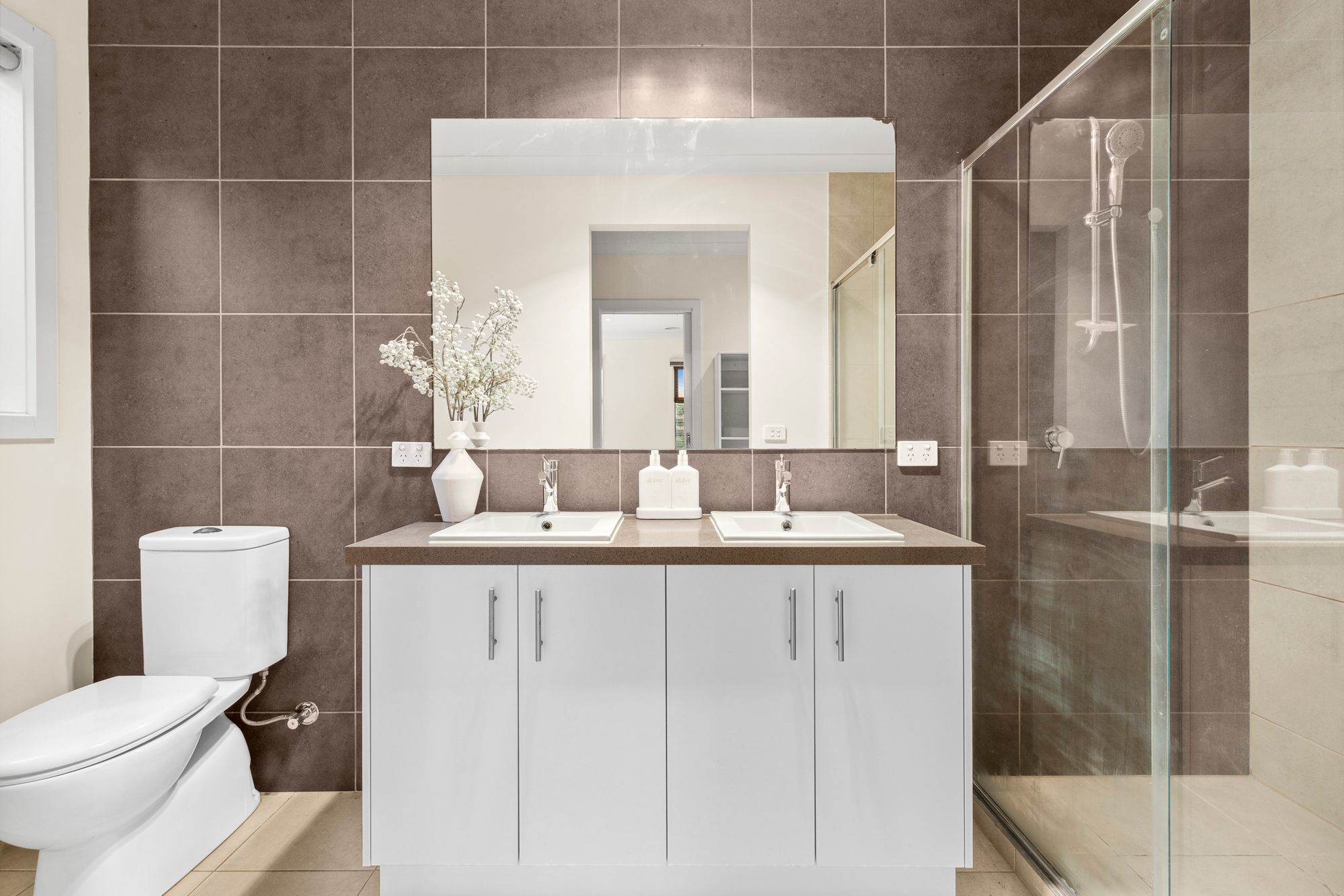 Ensuite; Twin vanity with ample storage, stone benchtop, mirror splashback, chrome fixtures, extended semi-frameless shower, open toilet.