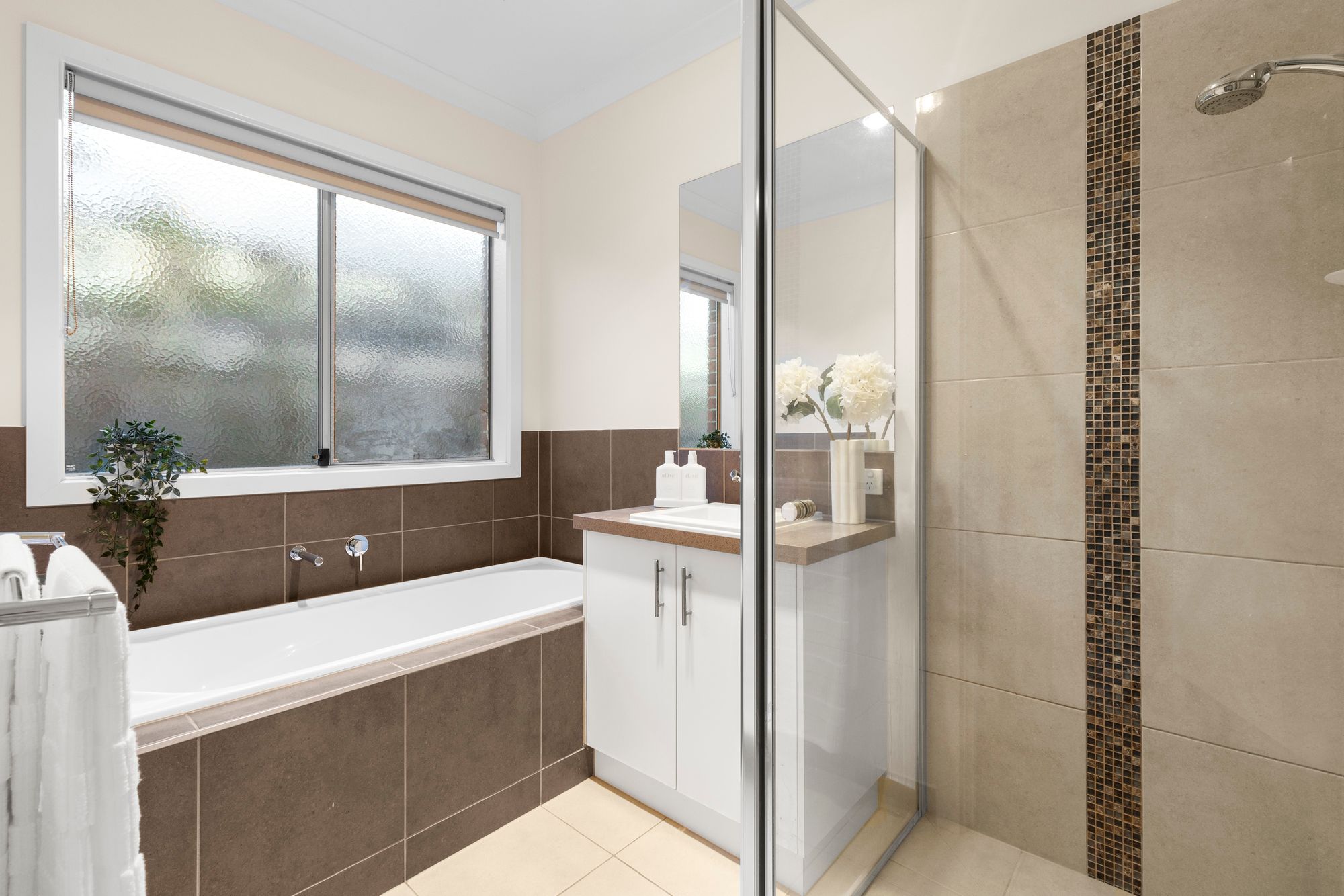 Main bathroom: 40mm stone benchtop, vanity & basin with storage, mirror splash back, chrome fittings, semi-frameless shower, frosted window with roller blinds, separate toilet, bath.