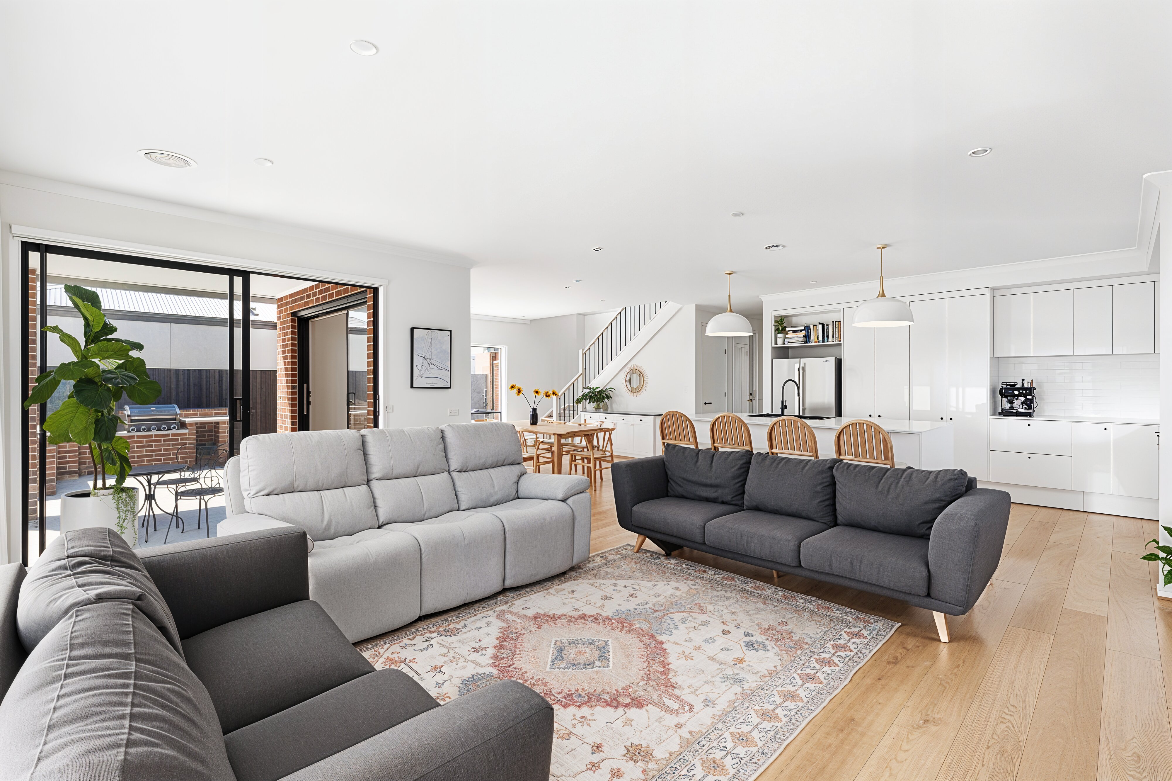 Open Plan Living/Dining: The open plan living and dining zone is flooded with natural light thanks to North and West facing windows, delivering all-day sun and a warm, inviting atmosphere. High ceilings and downlights enhance the sense of openness. A VJ panelling feature wall adds character to the living space while the windows and glass doors are dressed with a blend of roller blinds and sheer curtains. Glass sliding doors provide seamless access to the North-West facing alfresco and rear yard, while the upgraded staircase and balustrade create a striking connection to the second level.